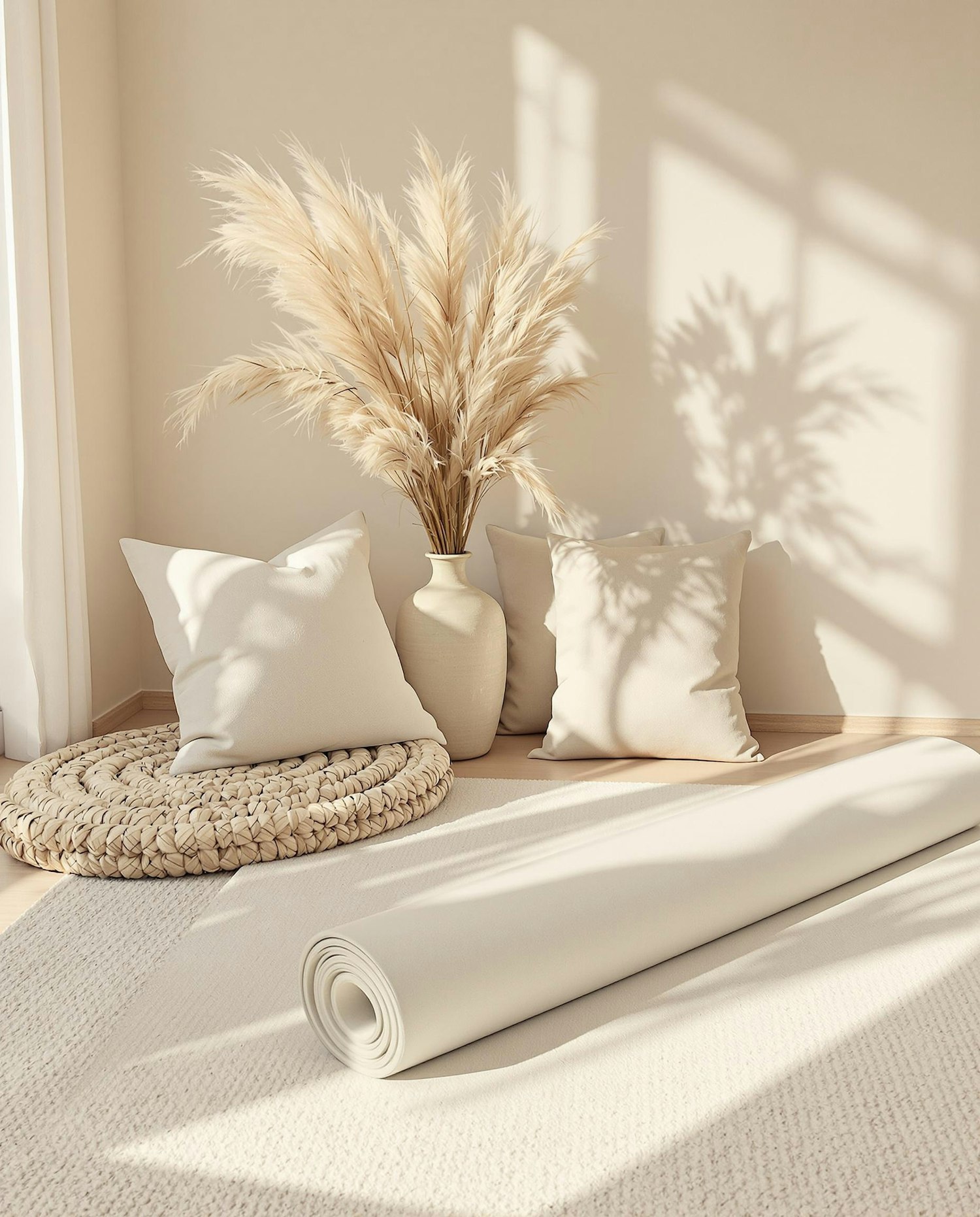 A soft tone-on-tone aesthetic interior: light beige yoga mat, neutral textured rug, soft pillows in linen and wool, a hint of dried pampas grass in a vase, morning golden light casting shadows, peaceful and stylish composition