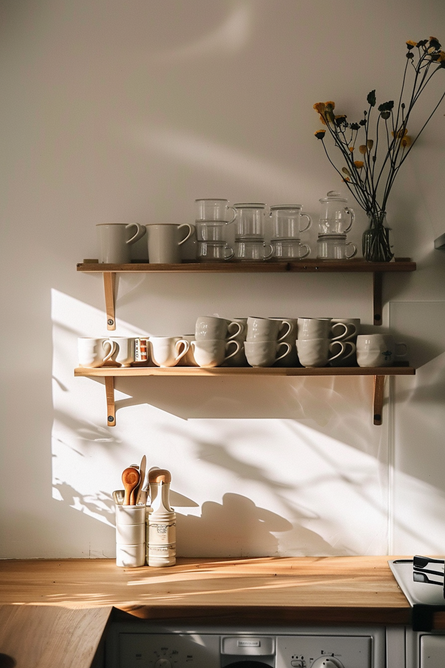 Cozy kitchen with wooden shelves, ceramic mugs, glass cups, and dried flowers. Sunlight casts soft shadows, creating a warm ambiance.