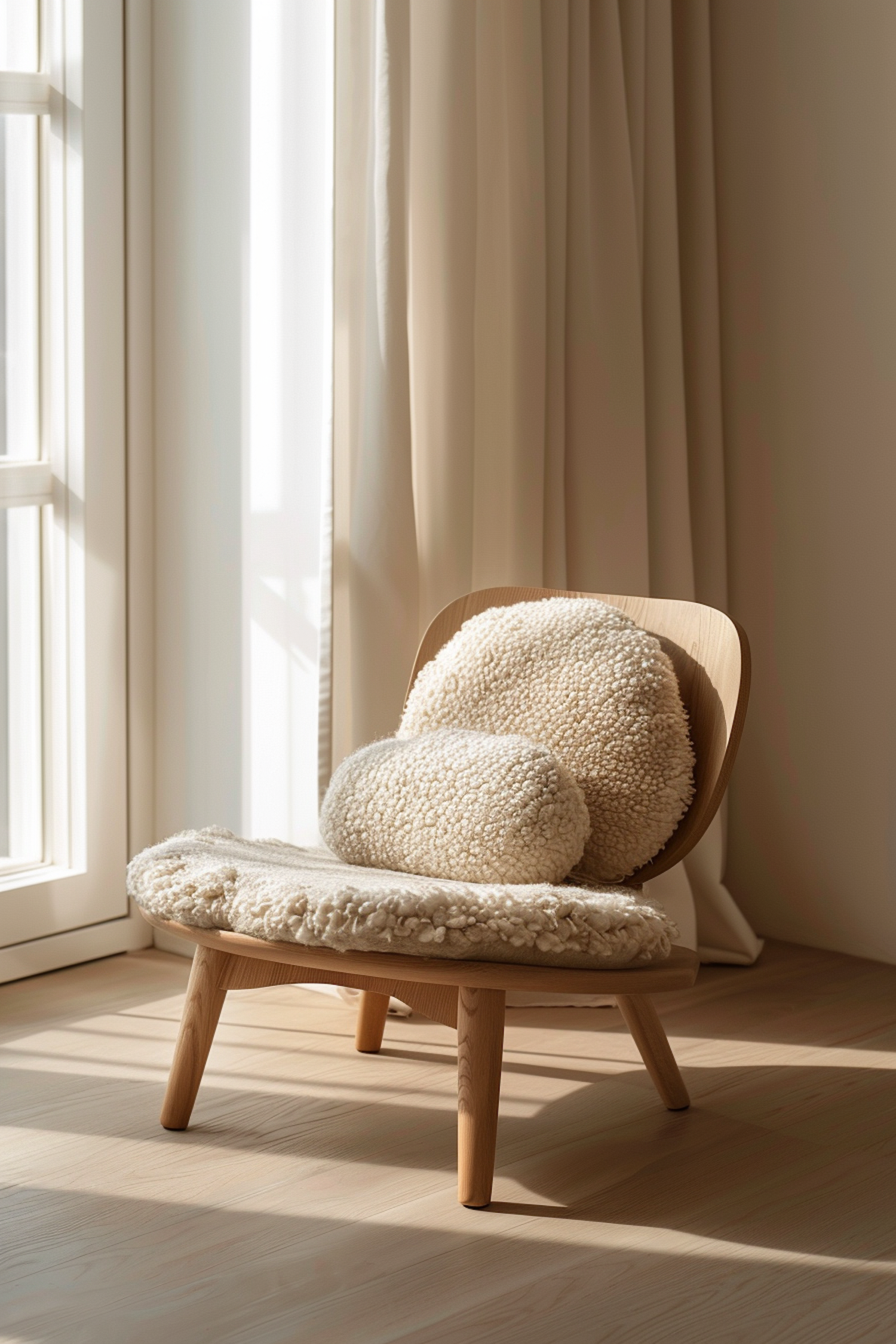 Minimalist wooden chair with plush cream cushions in a sunlit room, creating a cozy and serene atmosphere.