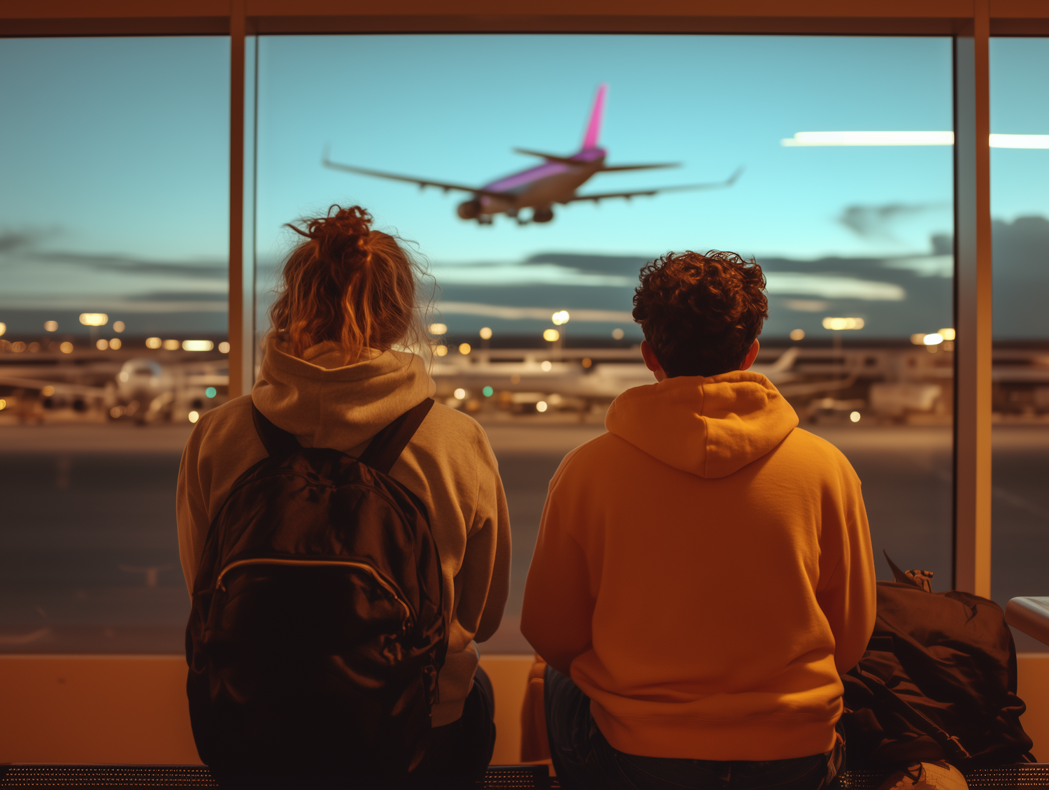Two people in hoodies watch a plane take off at an airport during twilight, creating a serene and contemplative scene.