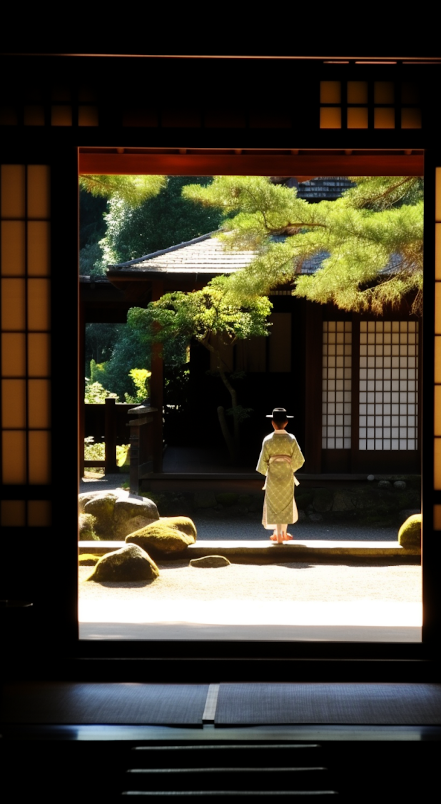 A person in a kimono stands in a tranquil Japanese garden, framed by traditional architecture and lush greenery.
