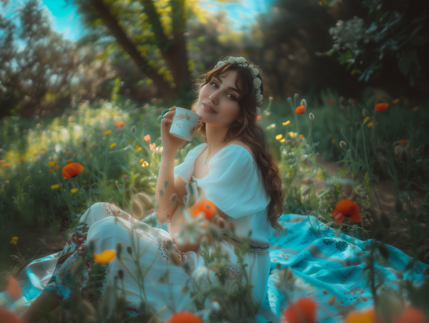 A serene woman in a floral dress and crown enjoys tea in a vibrant garden, surrounded by colorful flowers and warm sunlight.