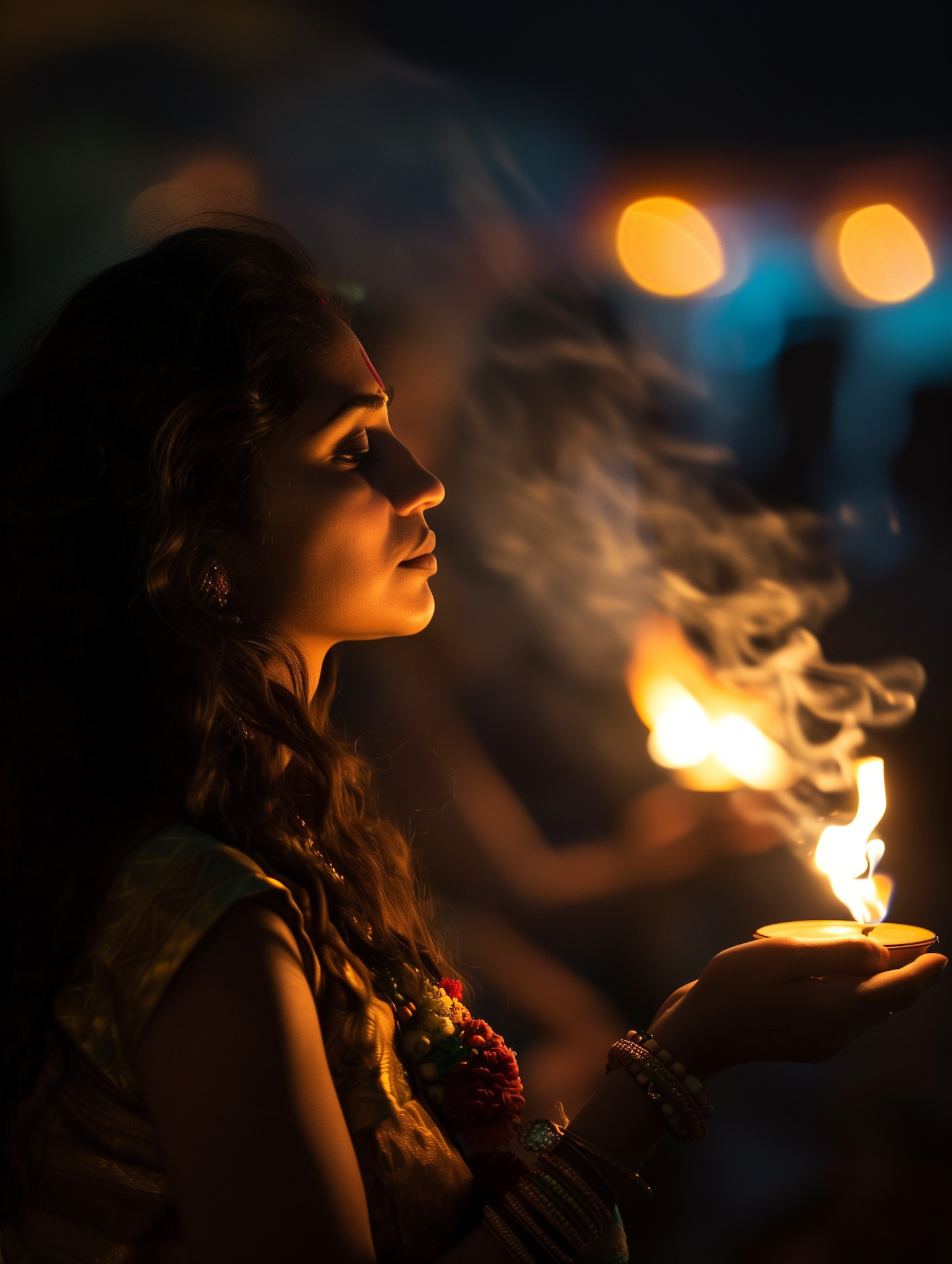 A woman in traditional attire holds a glowing oil lamp, creating a serene and spiritual atmosphere with blurred lights in the background.