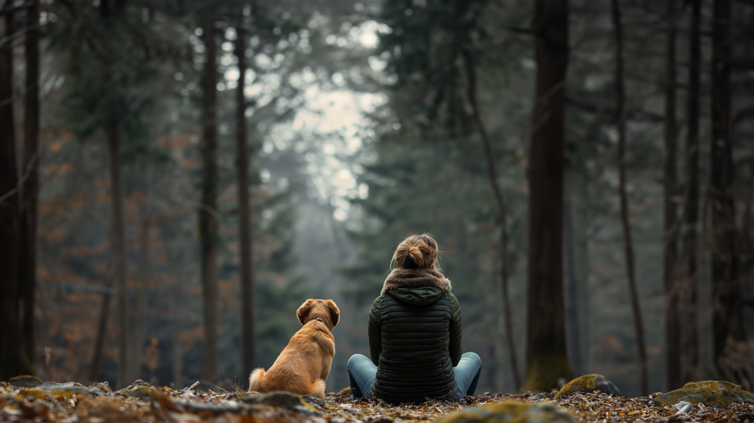 Woman and dog sitting in a serene forest, surrounded by tall trees and fallen leaves, enjoying a peaceful moment together.