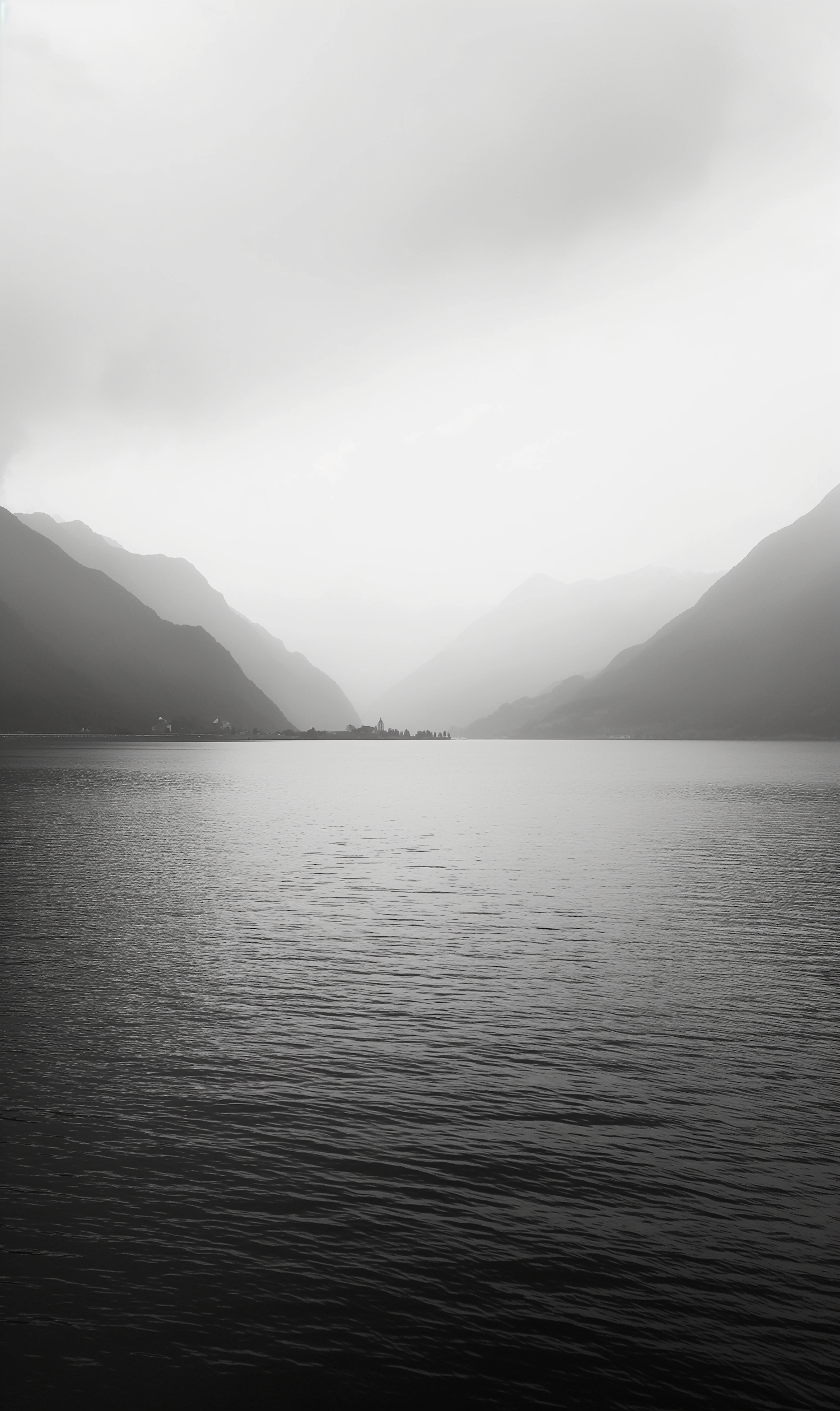 Grayscale image of a tranquil lake surrounded by misty mountains, with a small strip of land and faint structures in the distance.