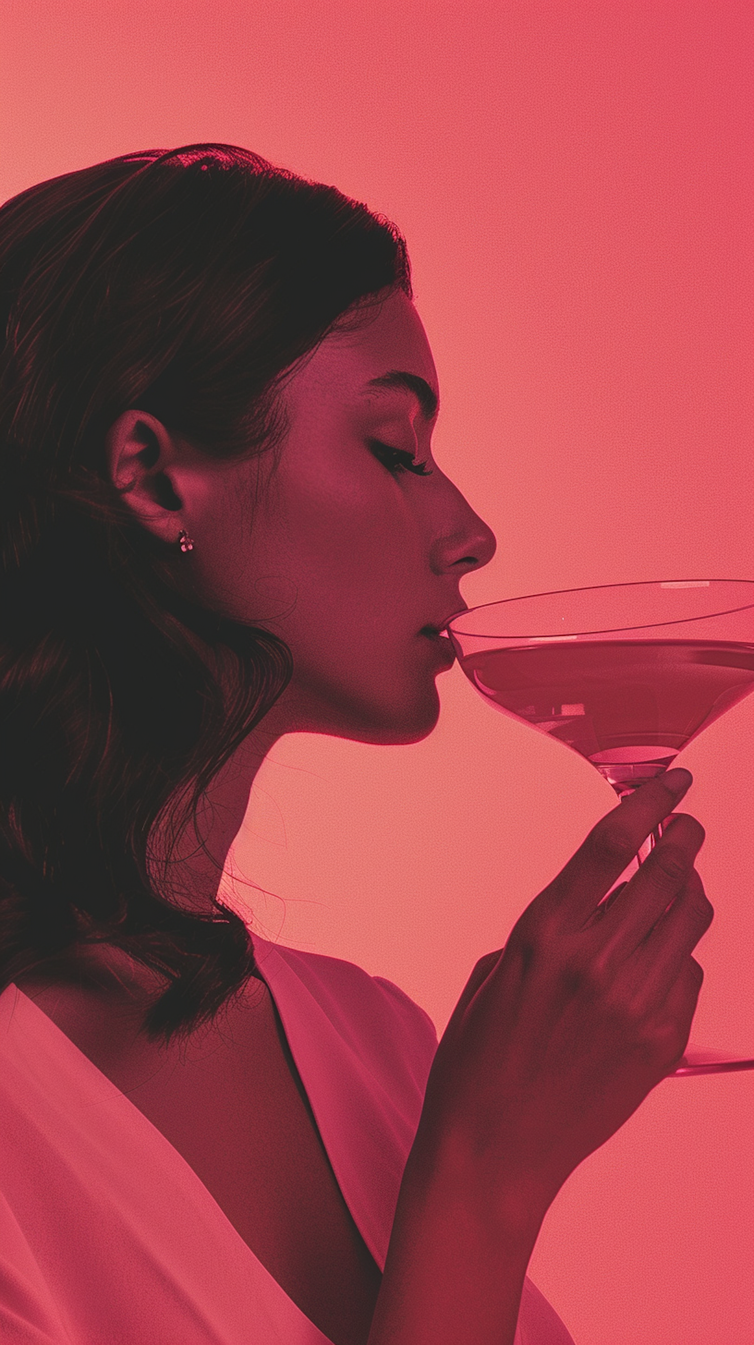 Elegant woman in profile with a martini glass against a red background, exuding sophistication and style.