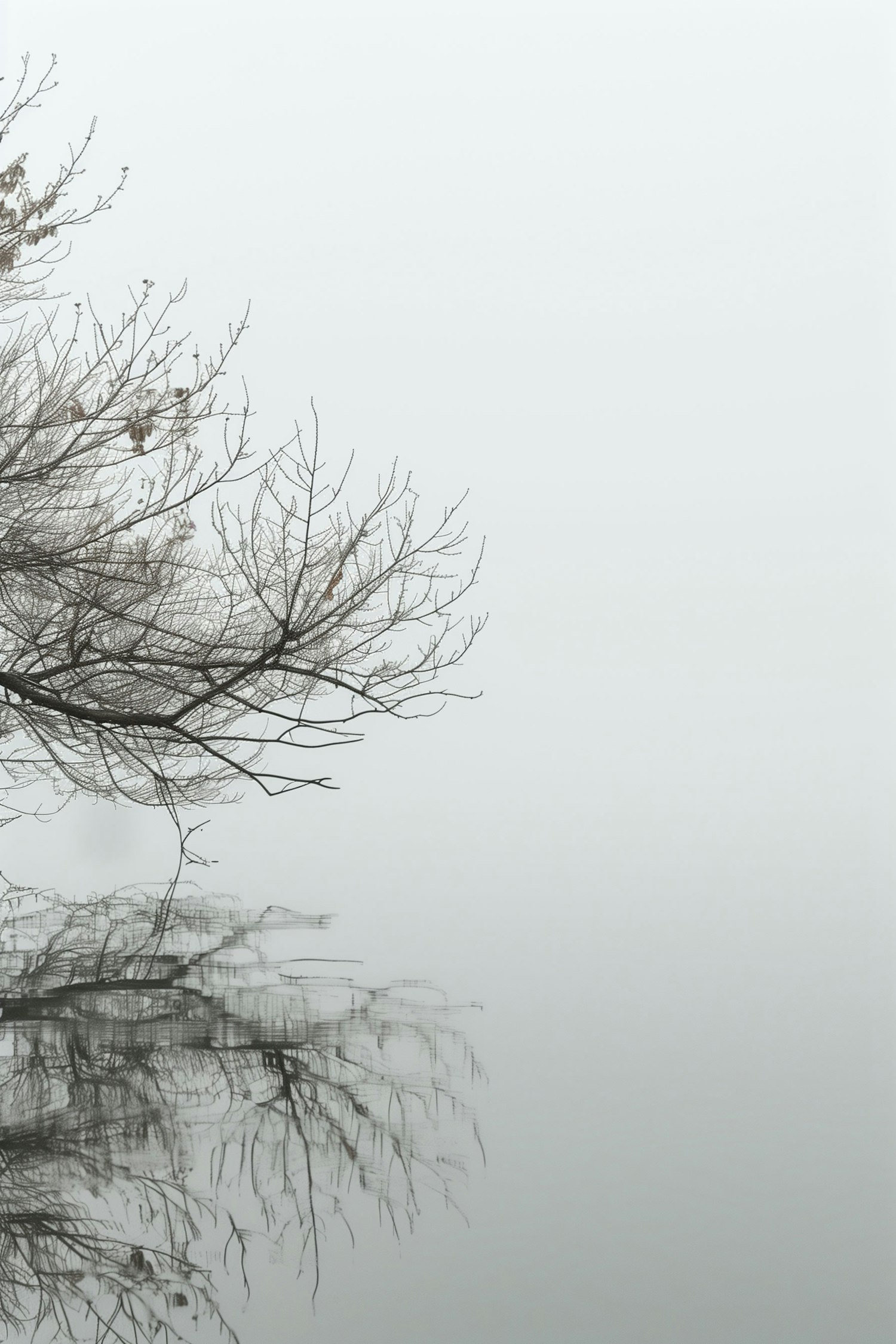 Minimalist scene with a bare tree branch reflected in calm water, set against a foggy gray background, creating a serene atmosphere.
