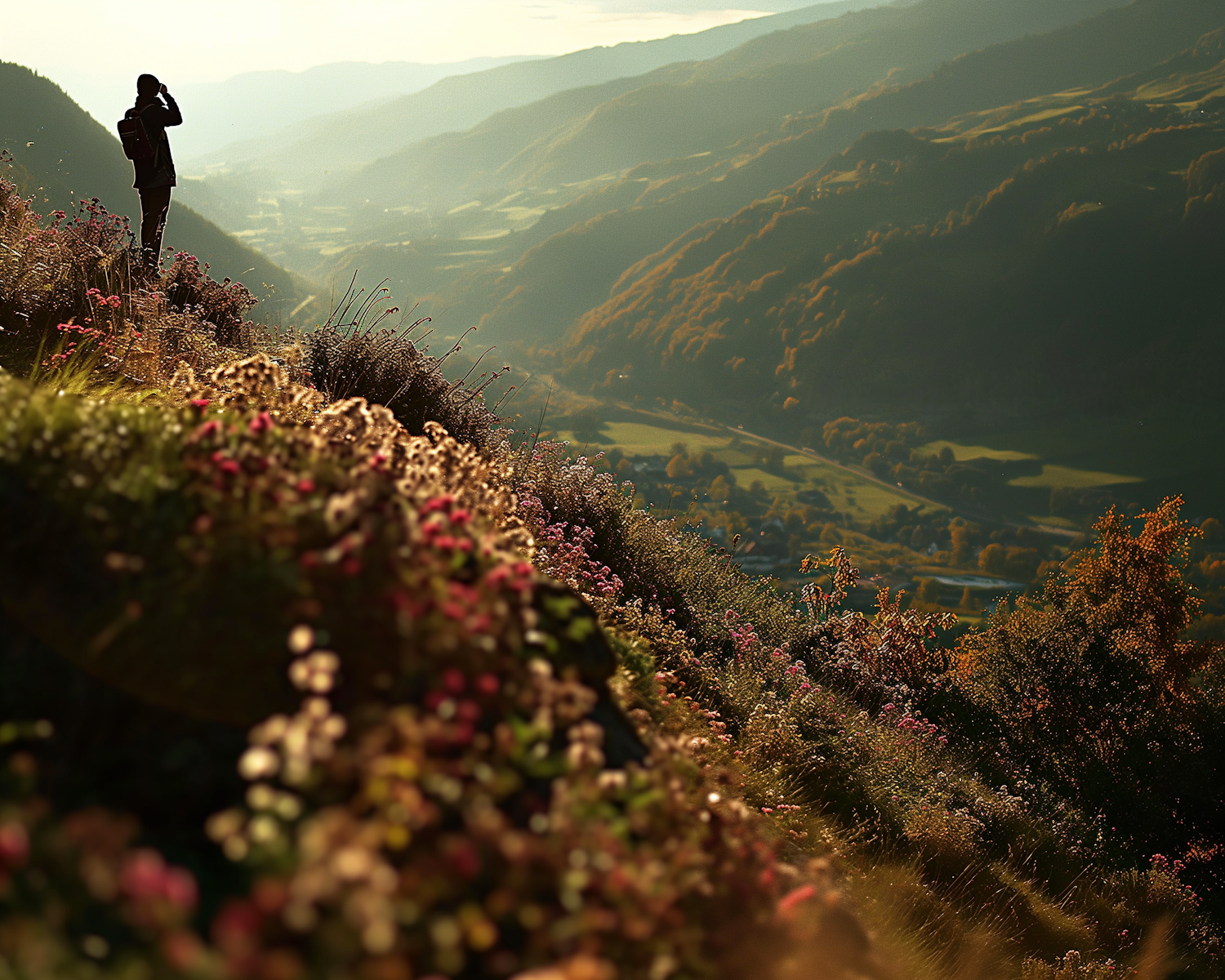 Silhouetted hiker on a flower-covered hillside overlooking a sunlit valley, capturing a serene and expansive landscape.