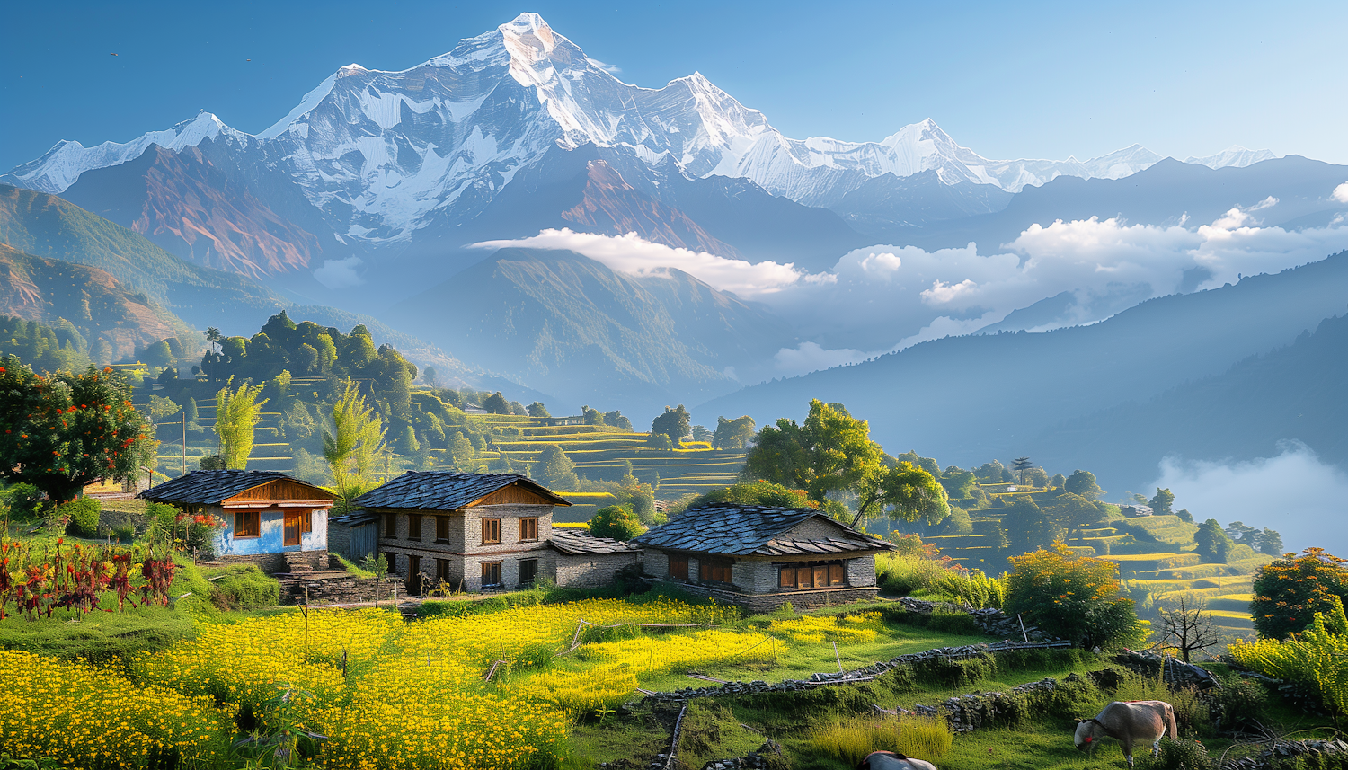 Idyllic rural landscape with stone houses, yellow flowers, grazing cows, and majestic snow-capped mountains under a clear blue sky.