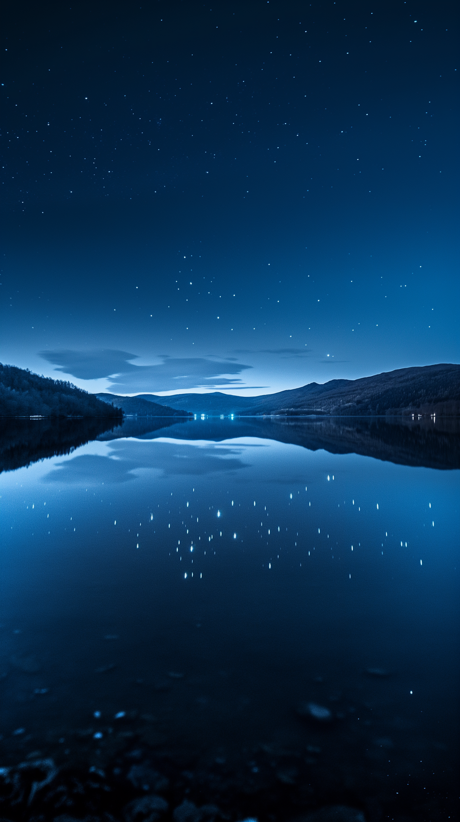 Tranquil night scene with starry sky reflecting on a calm lake, framed by dark hills. Deep blue hues create a serene atmosphere.