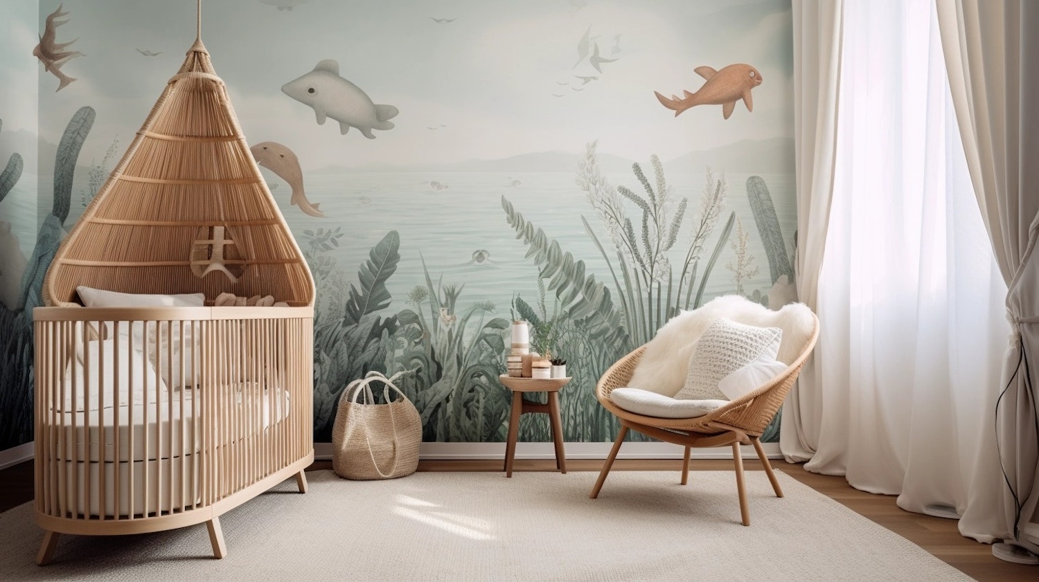 Serene nursery with ocean-themed mural, rattan crib, cozy chair, and soft lighting. Perfect for a calming baby room.
