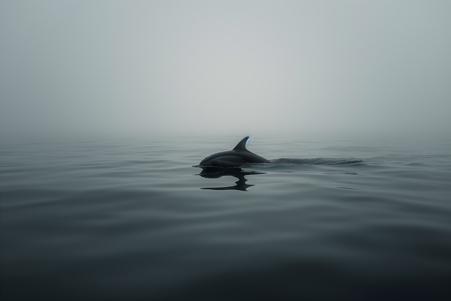 A dolphin swims through misty waters, creating a serene and tranquil scene with gentle ripples and a soft, gray fog.