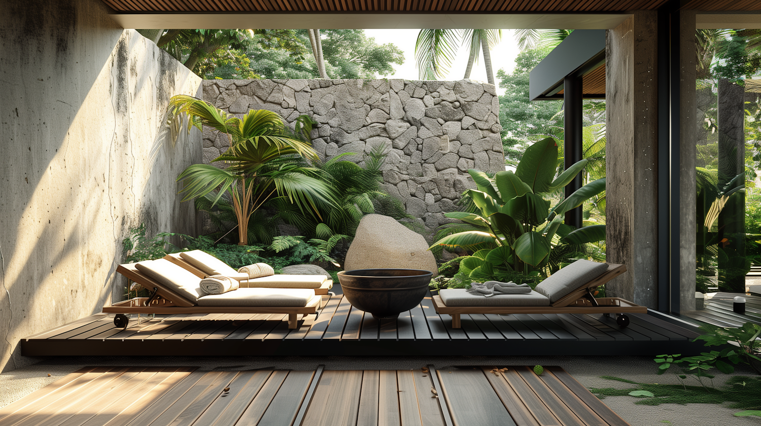 Tranquil outdoor lounge with wooden chairs, lush greenery, and a stone bowl centerpiece, perfect for relaxation and serenity.
