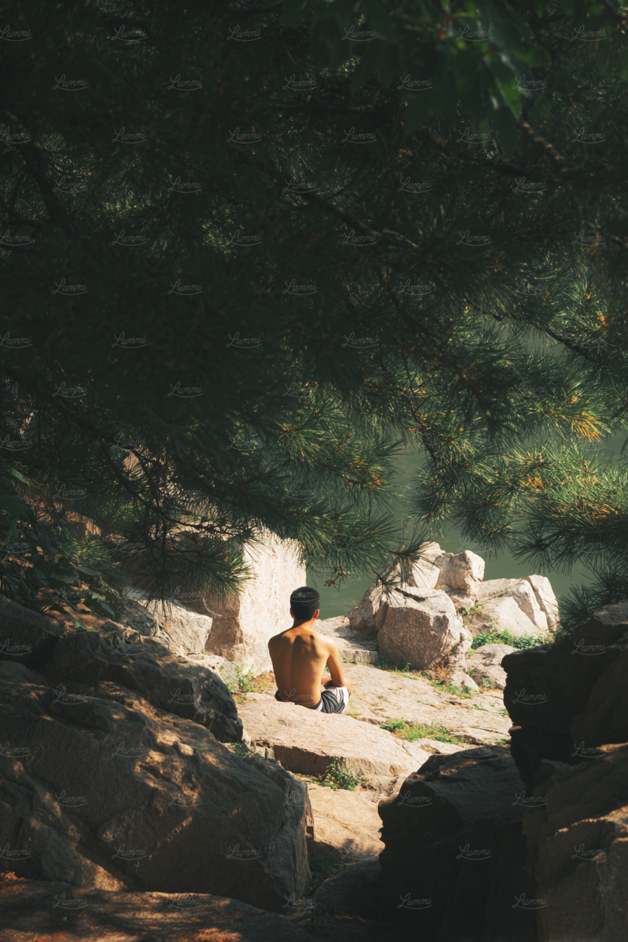 A person sits on sunlit rocks near a calm lake, surrounded by lush pine trees, creating a peaceful and natural outdoor scene.
