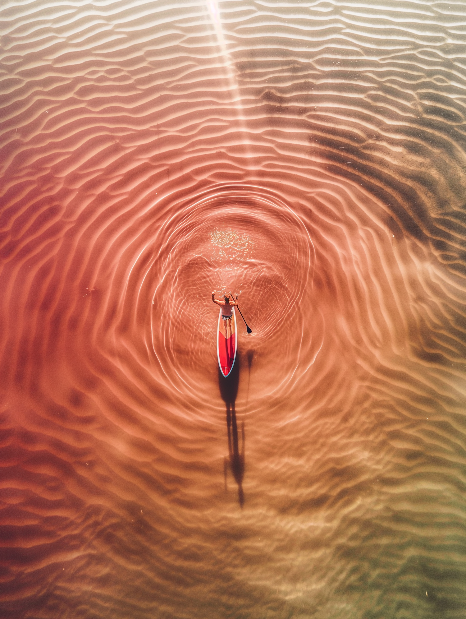 Aerial view of a paddleboarder on rippling, reddish water, casting a long shadow. Serene and artistic composition.