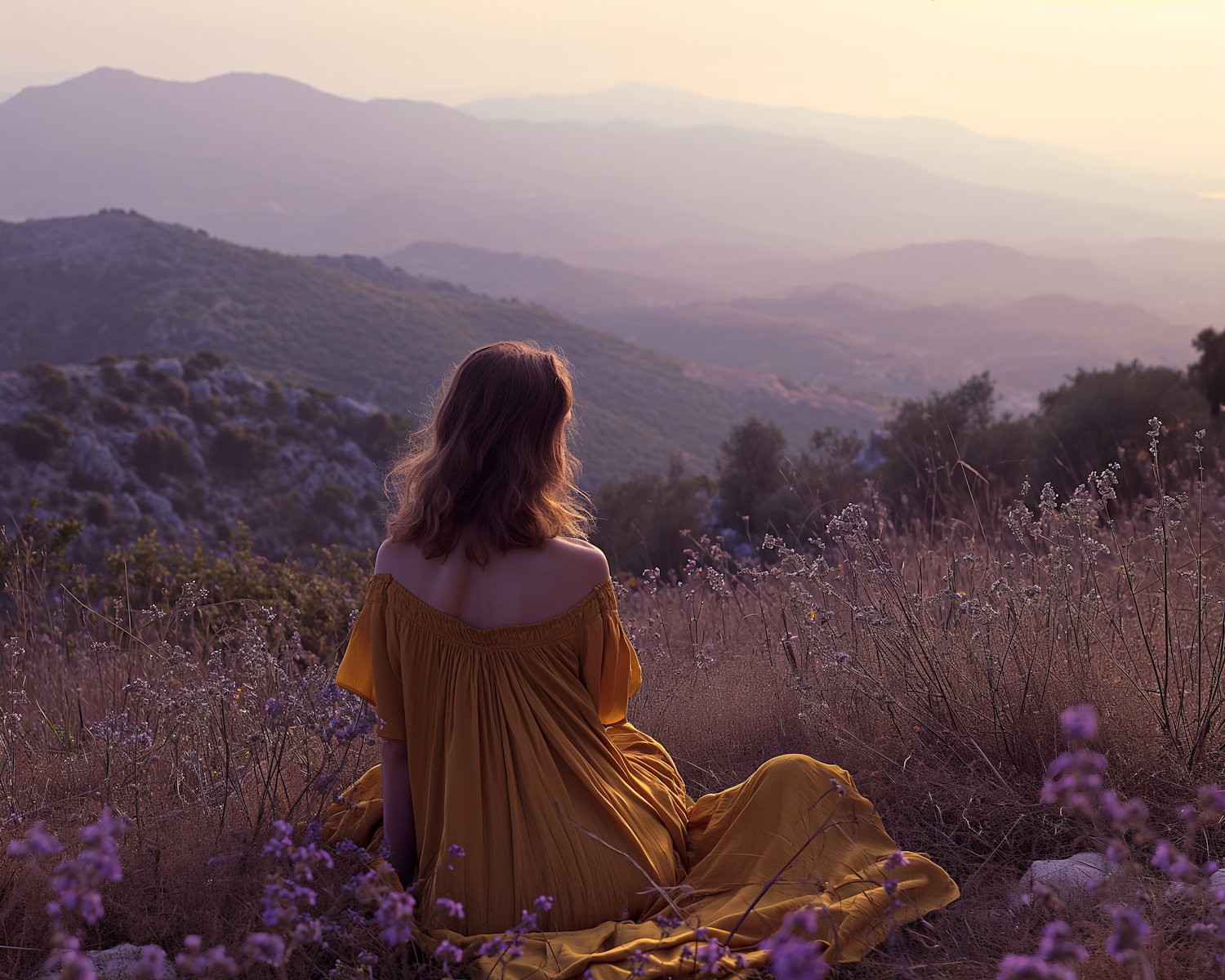 Woman in a flowing yellow dress sits in a wildflower field, gazing at a serene mountain landscape during a golden sunset.