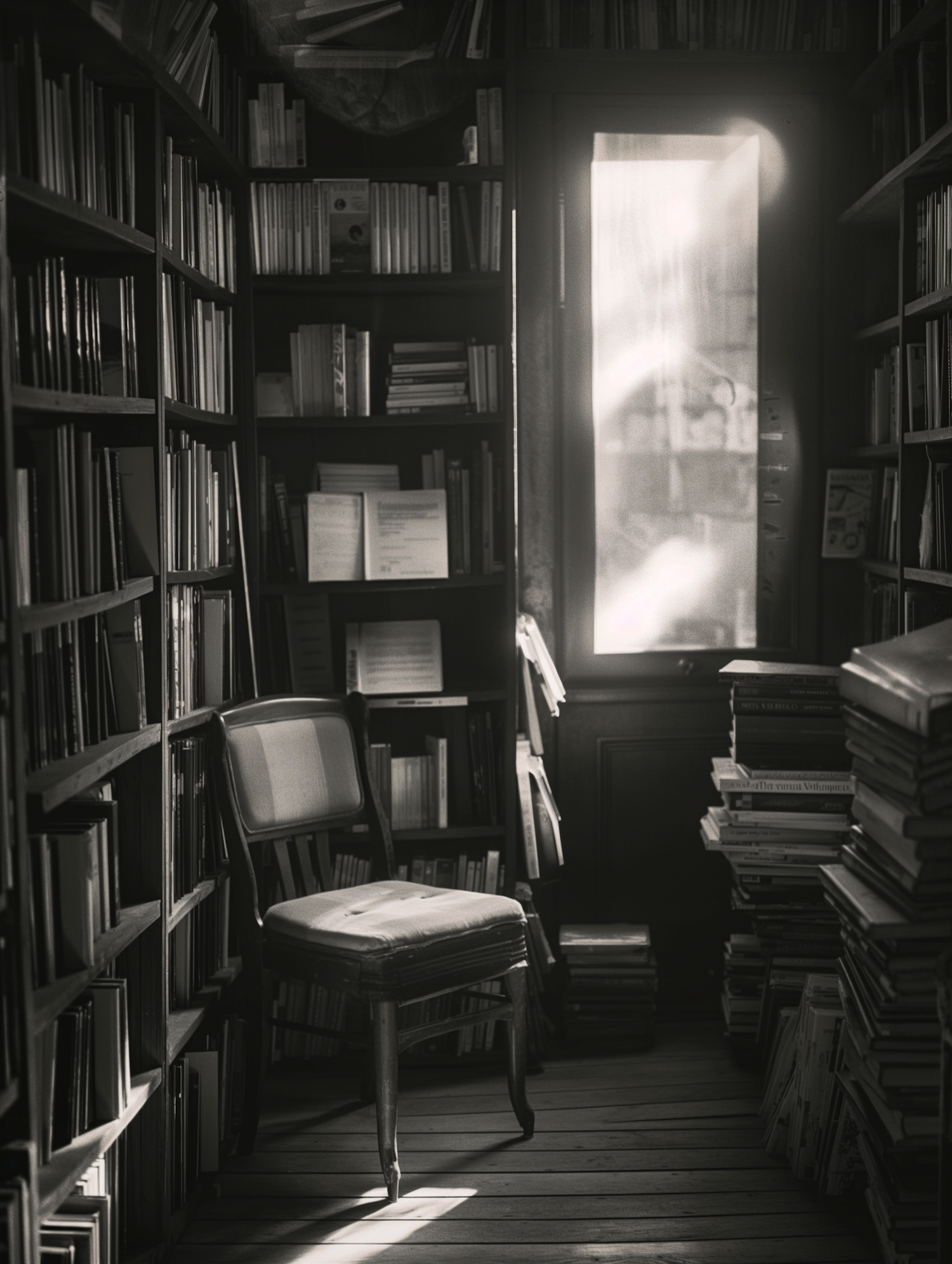 Cozy library aisle with wooden chair, surrounded by bookshelves and soft sunlight streaming through a window.