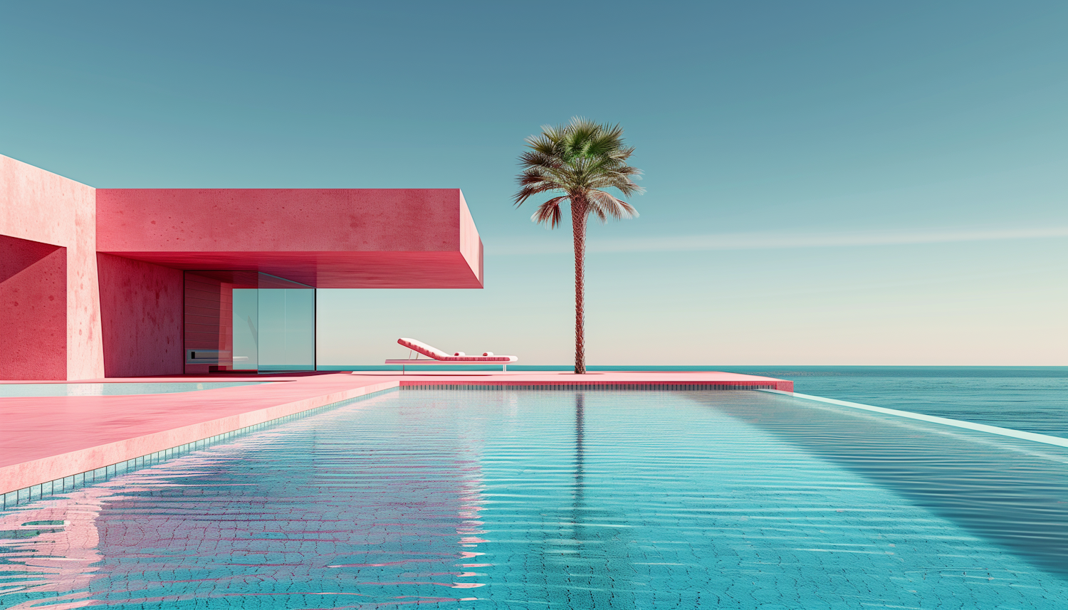 Modern minimalist architecture with pink concrete, infinity pool, and palm tree by the ocean. Tranquil and luxurious setting.