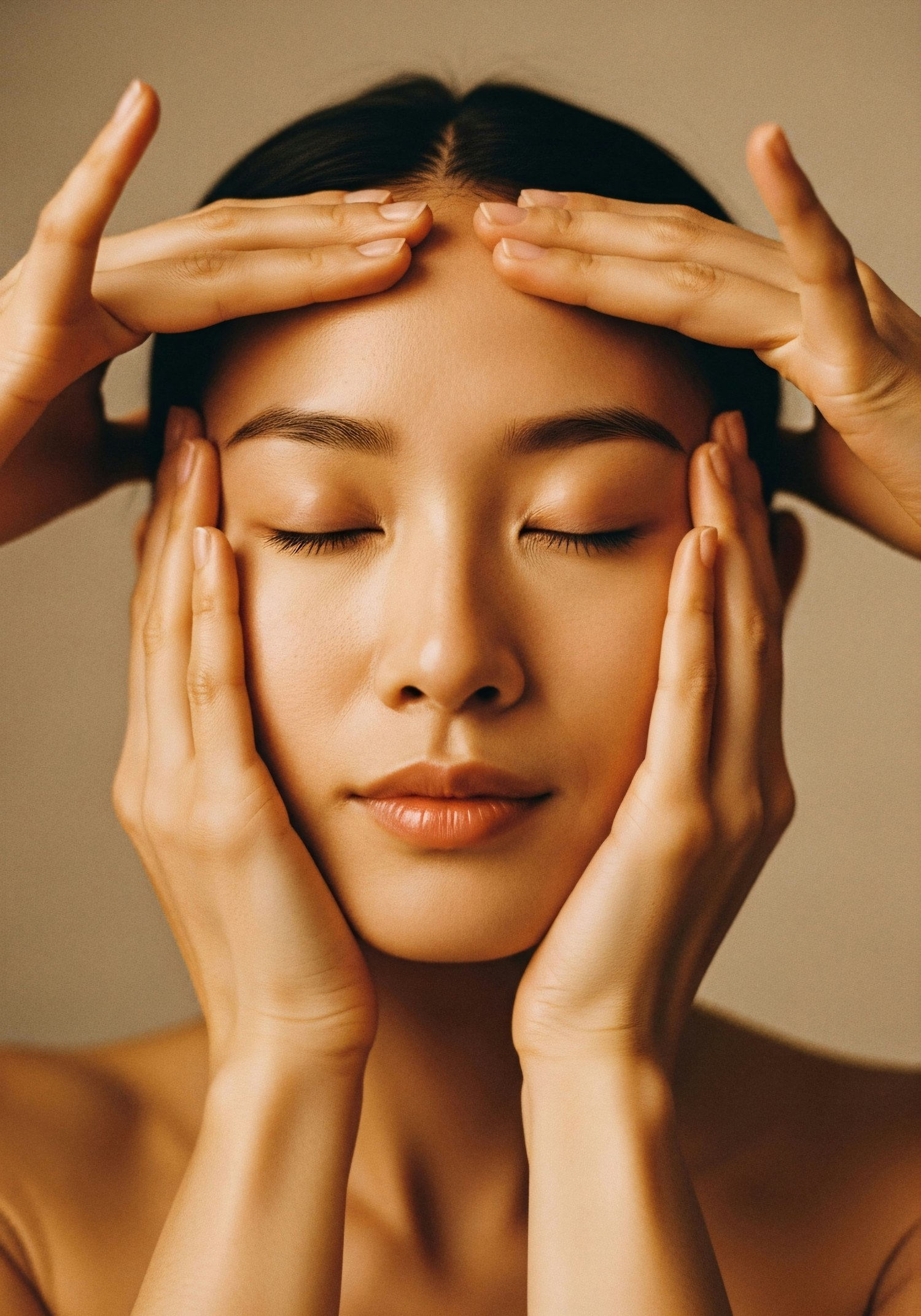 A serene close-up of a woman with her eyes closed, her face framed by hands gently touching her forehead and cheeks.