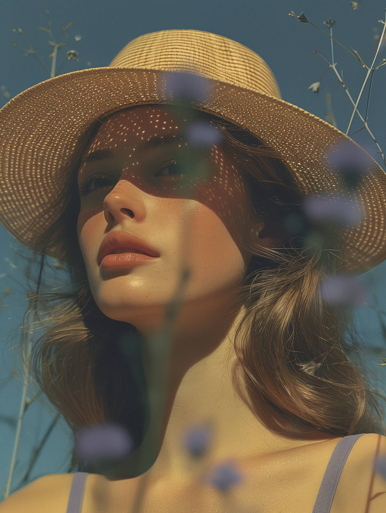 Serene portrait of a woman in a straw hat with wildflowers and a clear blue sky, capturing a dreamy summer vibe.