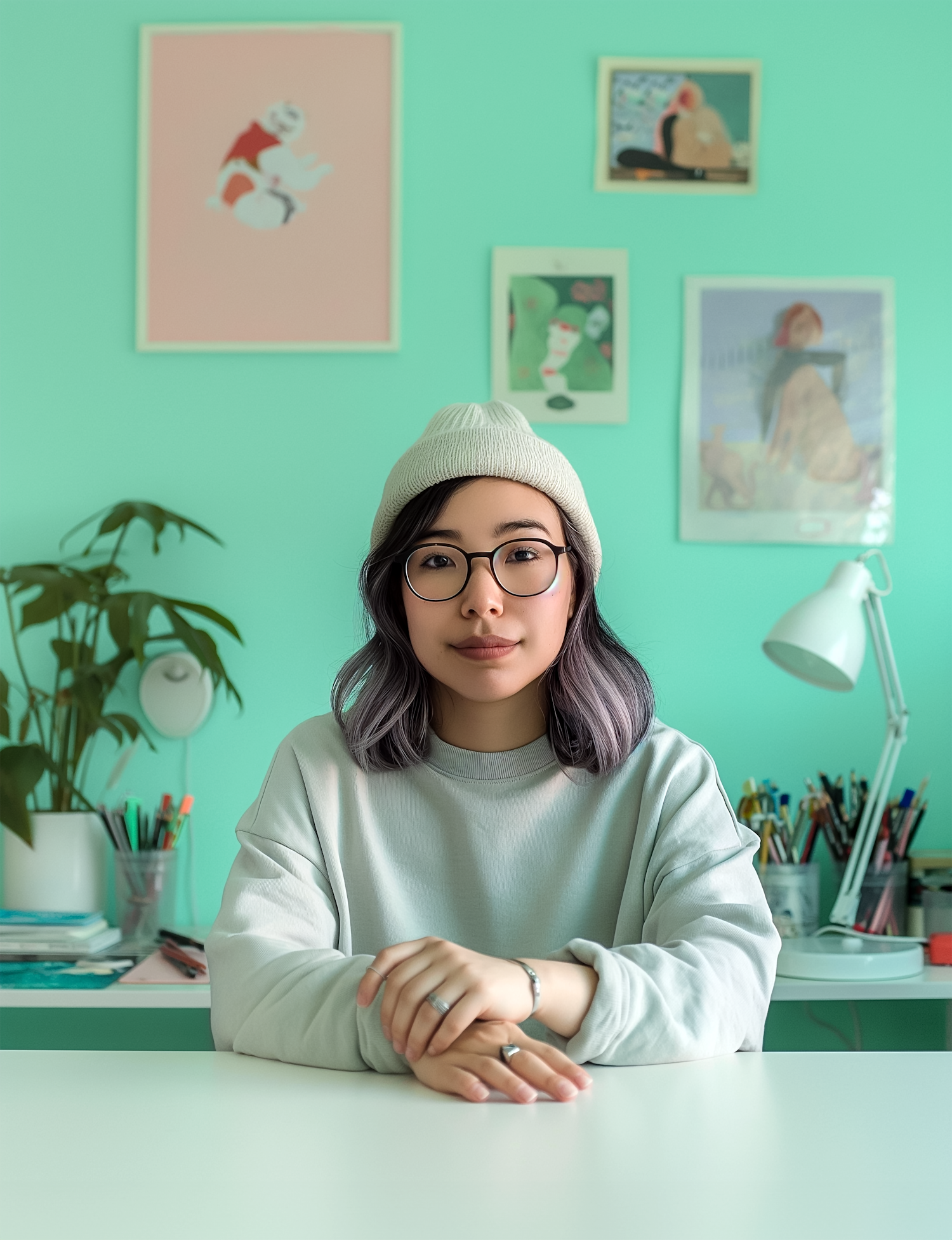 Asian woman with gray hair and glasses sits at a desk with art supplies, against a mint green wall with framed artworks.