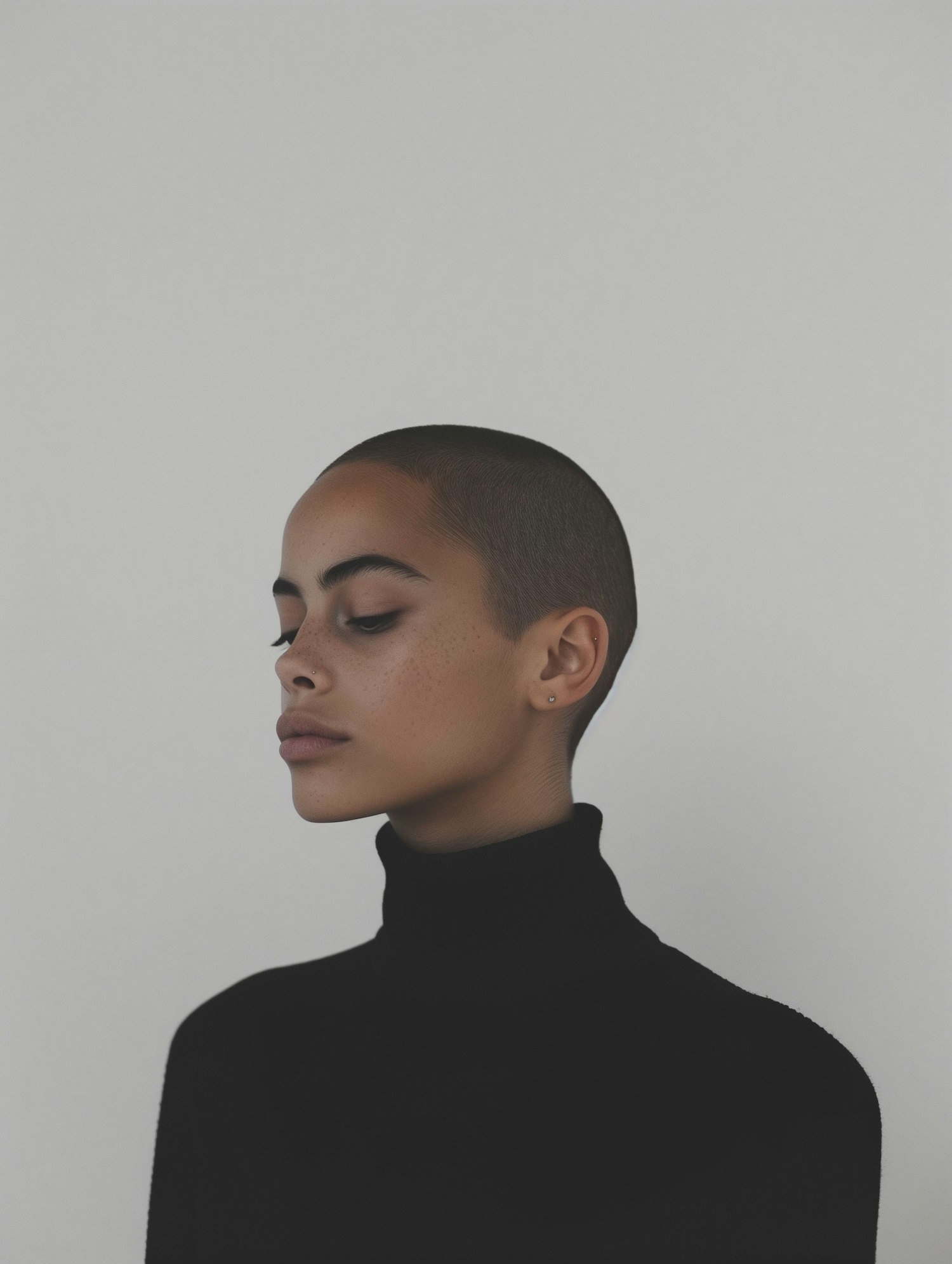 Minimalist portrait of a serene woman with a shaved head in a black turtleneck against a plain background.