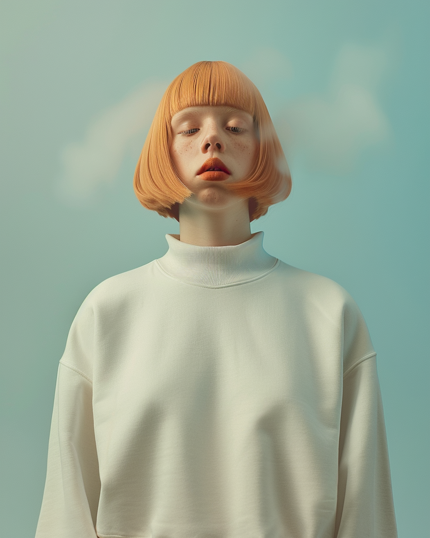 Serene portrait of a person with orange hair and freckles, wearing a cream sweater against a teal background with a dreamy atmosphere.