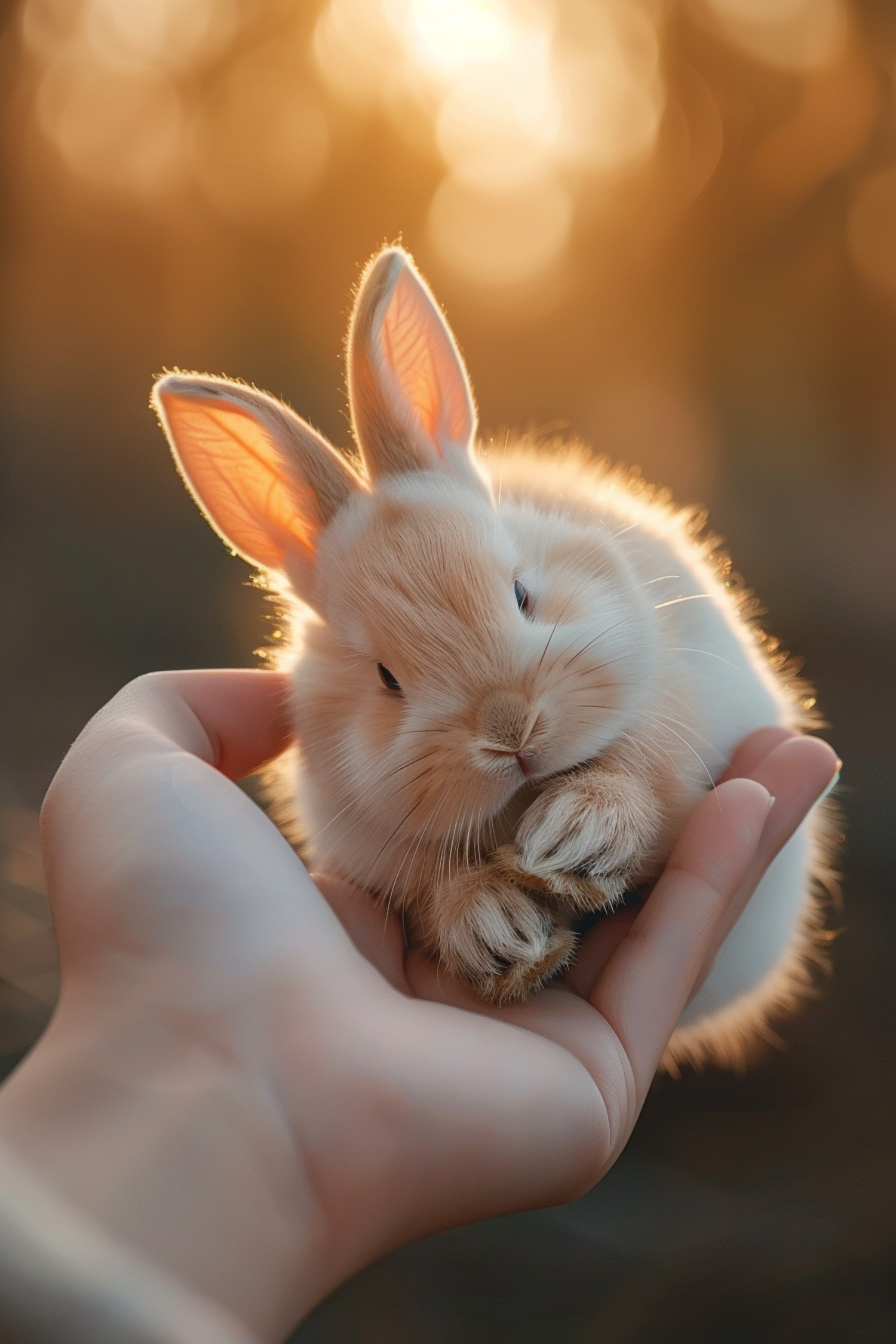 Adorable baby rabbit with beige fur cradled in a hand, glowing in warm golden sunlight with a serene expression.