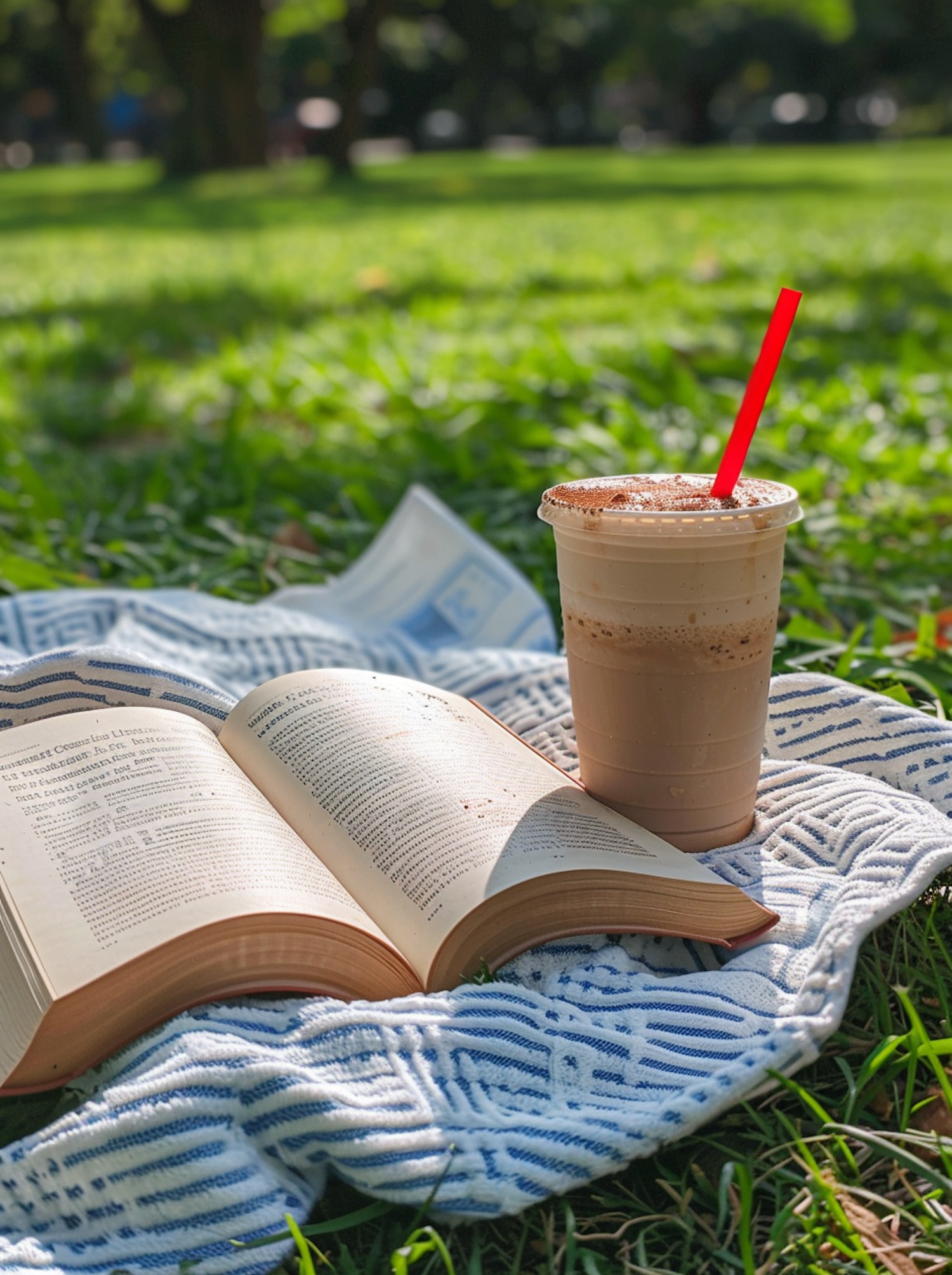 Open book and iced coffee on a blanket in a sunny park, perfect for a relaxing outdoor reading session.
