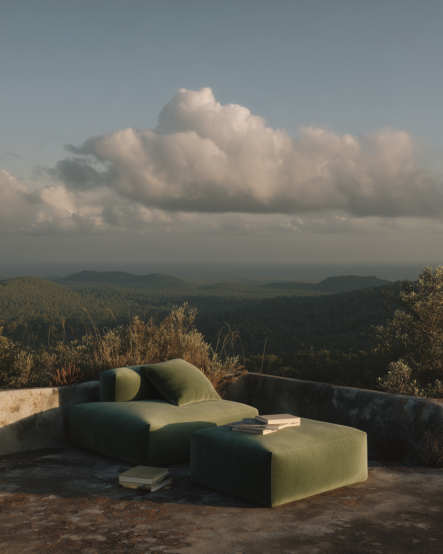 Cozy green lounge chair and ottoman on a terrace with books, overlooking a lush forest and a sky filled with soft clouds.