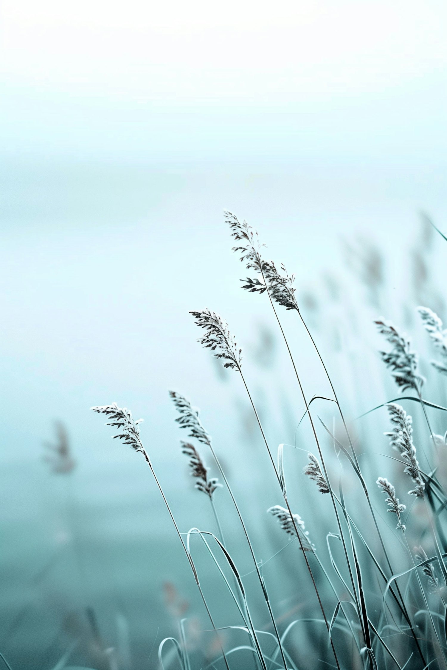 Serene image of delicate grass stalks against a soft blue-green background, evoking tranquility and natural elegance.