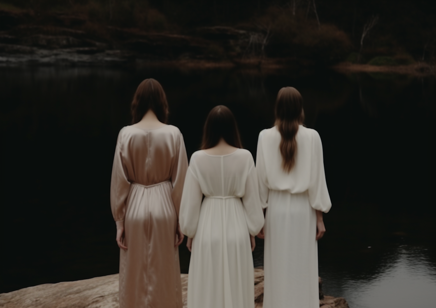 Three women in flowing gowns stand by a dark lake, creating a serene and mysterious atmosphere.