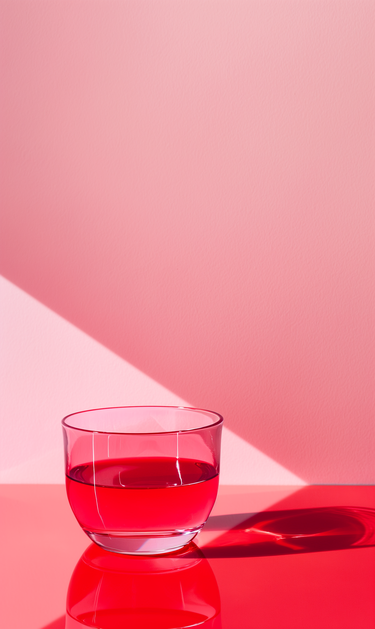 Minimalistic scene with a glass of red liquid on a glossy red surface against a soft pink background.