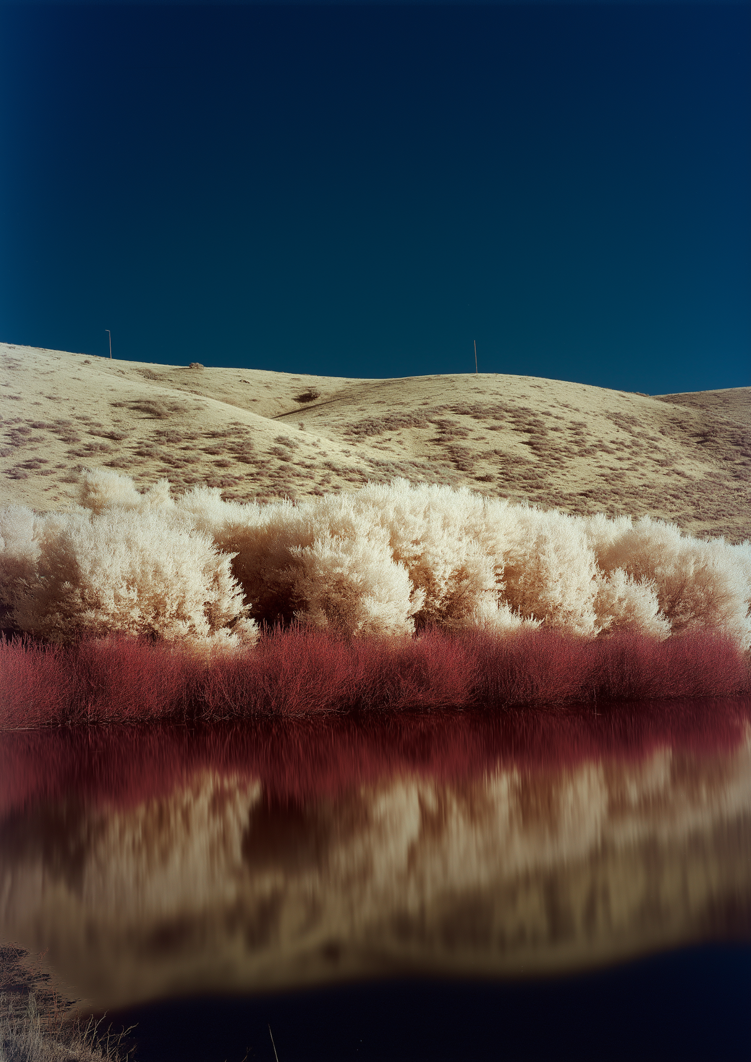 A tranquil landscape with reflective water, vibrant red shrubs, pale trees, golden hills, and a deep blue sky, creating a striking contrast.