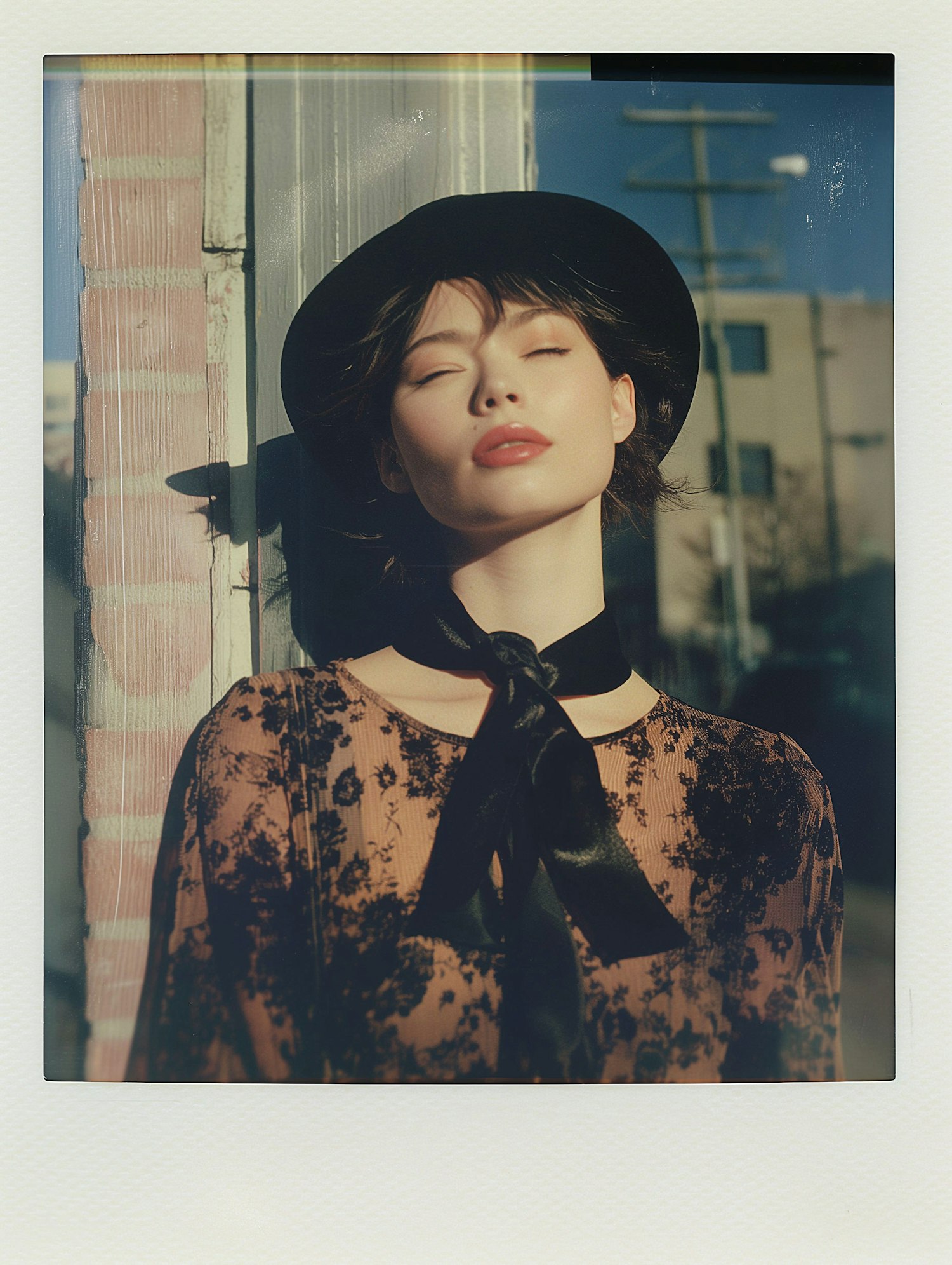 Stylish woman in a black hat and floral blouse basks in sunlight against a brick wall, evoking a vintage, serene vibe.