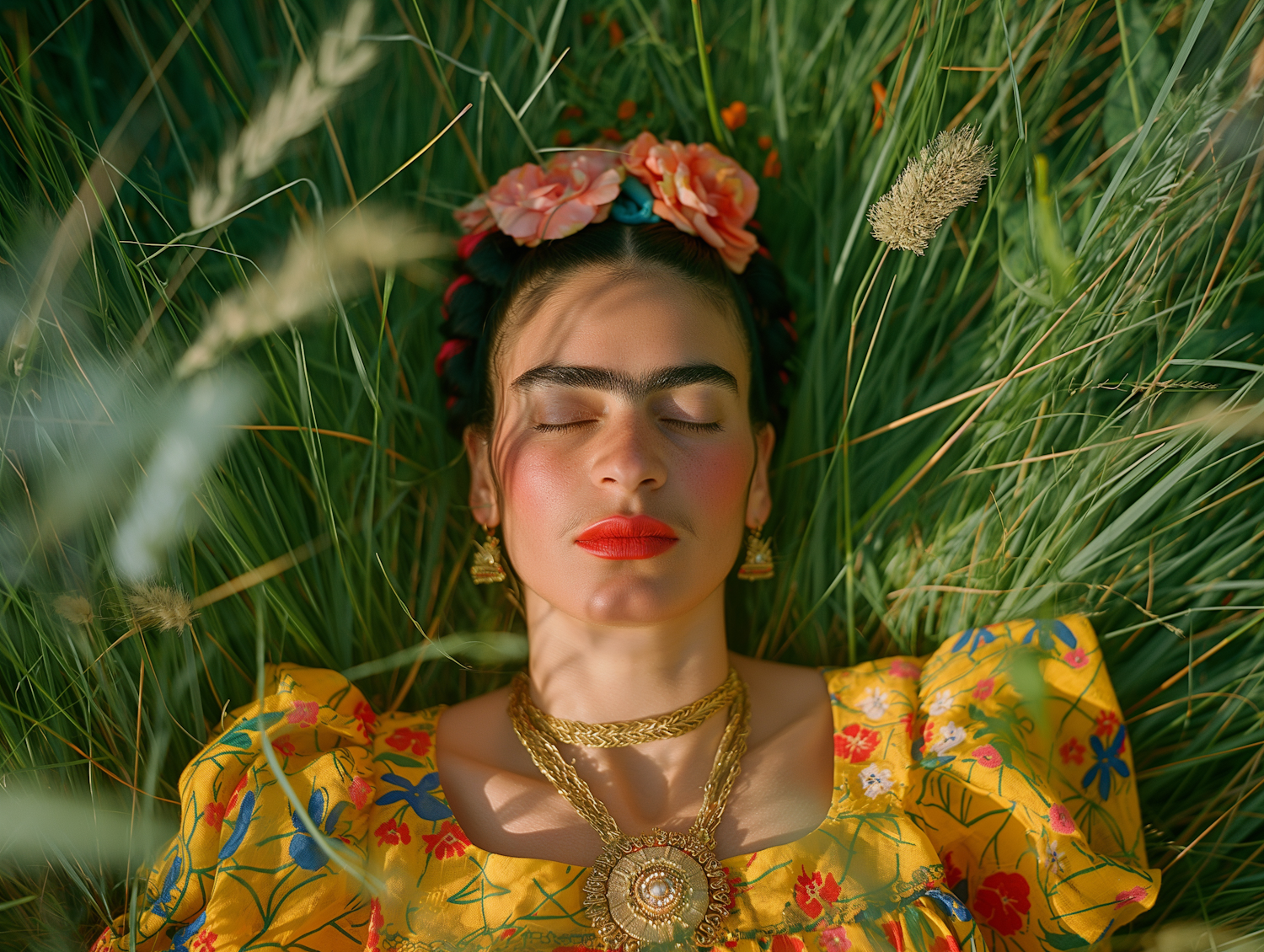 Woman in vibrant yellow floral dress lying in green grass, adorned with flowers and gold jewelry, eyes closed in serene expression.