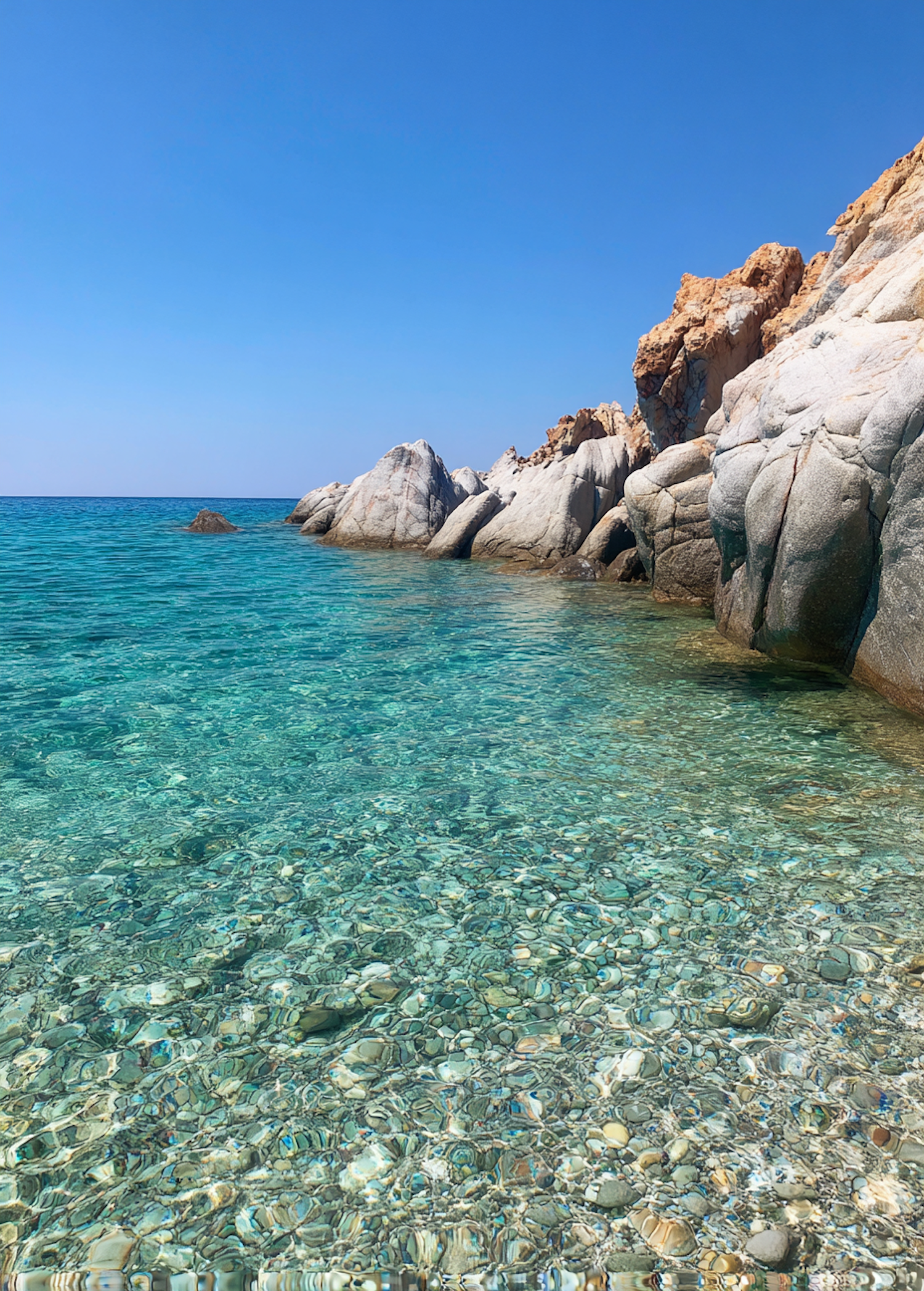 Crystal-clear turquoise waters meet rugged rocky shores under a bright blue sky, creating a serene and picturesque coastal view.