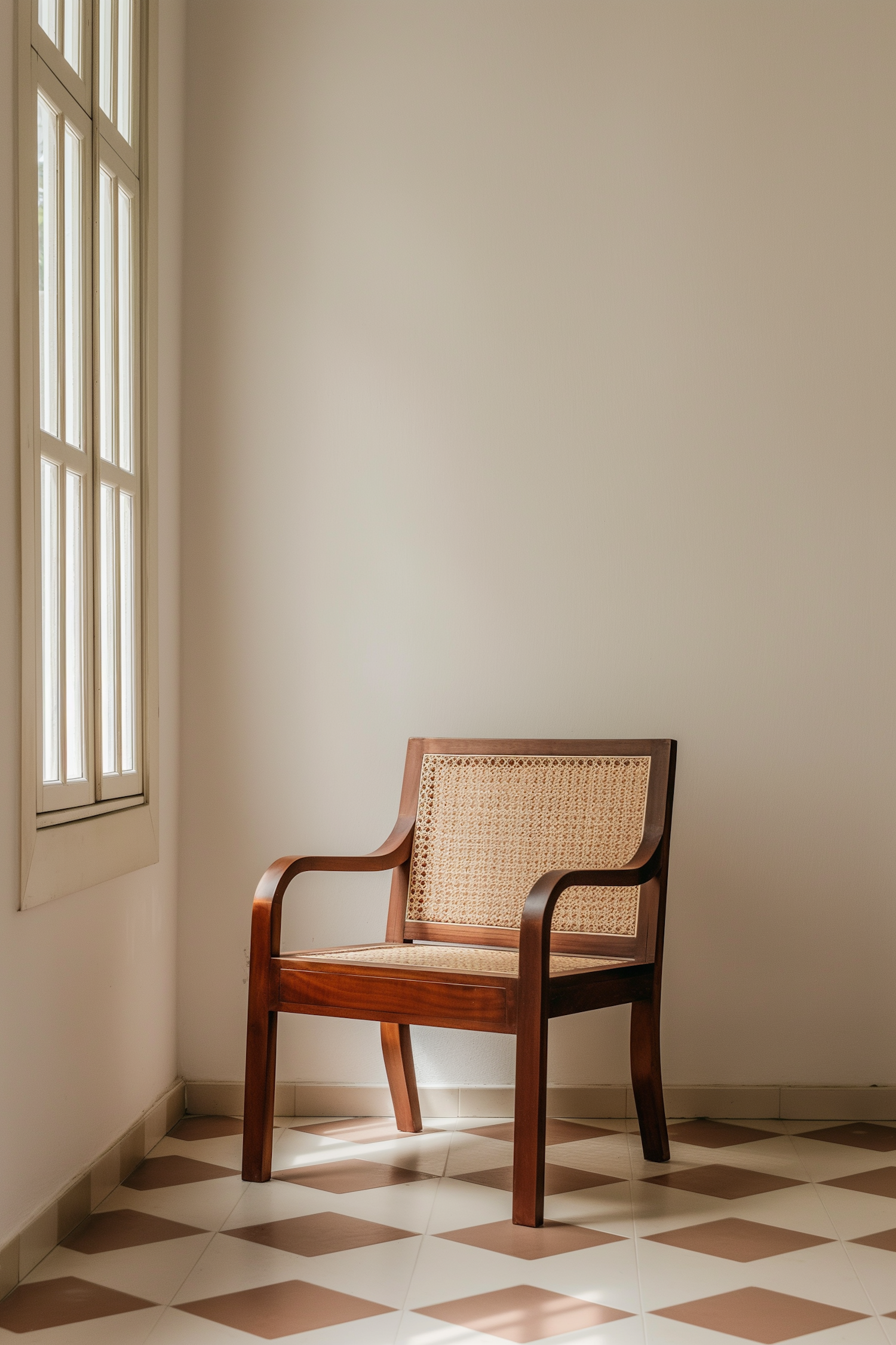 Minimalist wooden chair with rattan backrest near a window, set in a serene room with checkered tile flooring and soft natural light.