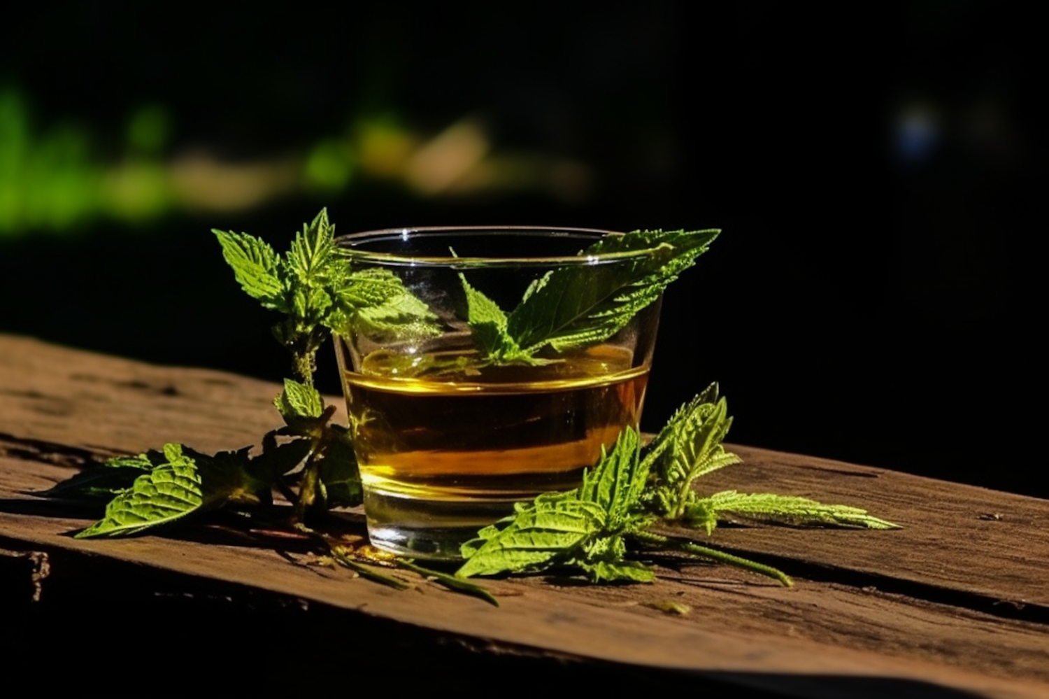 Glass of golden liquid with fresh green leaves on a rustic wooden surface, bathed in warm sunlight.