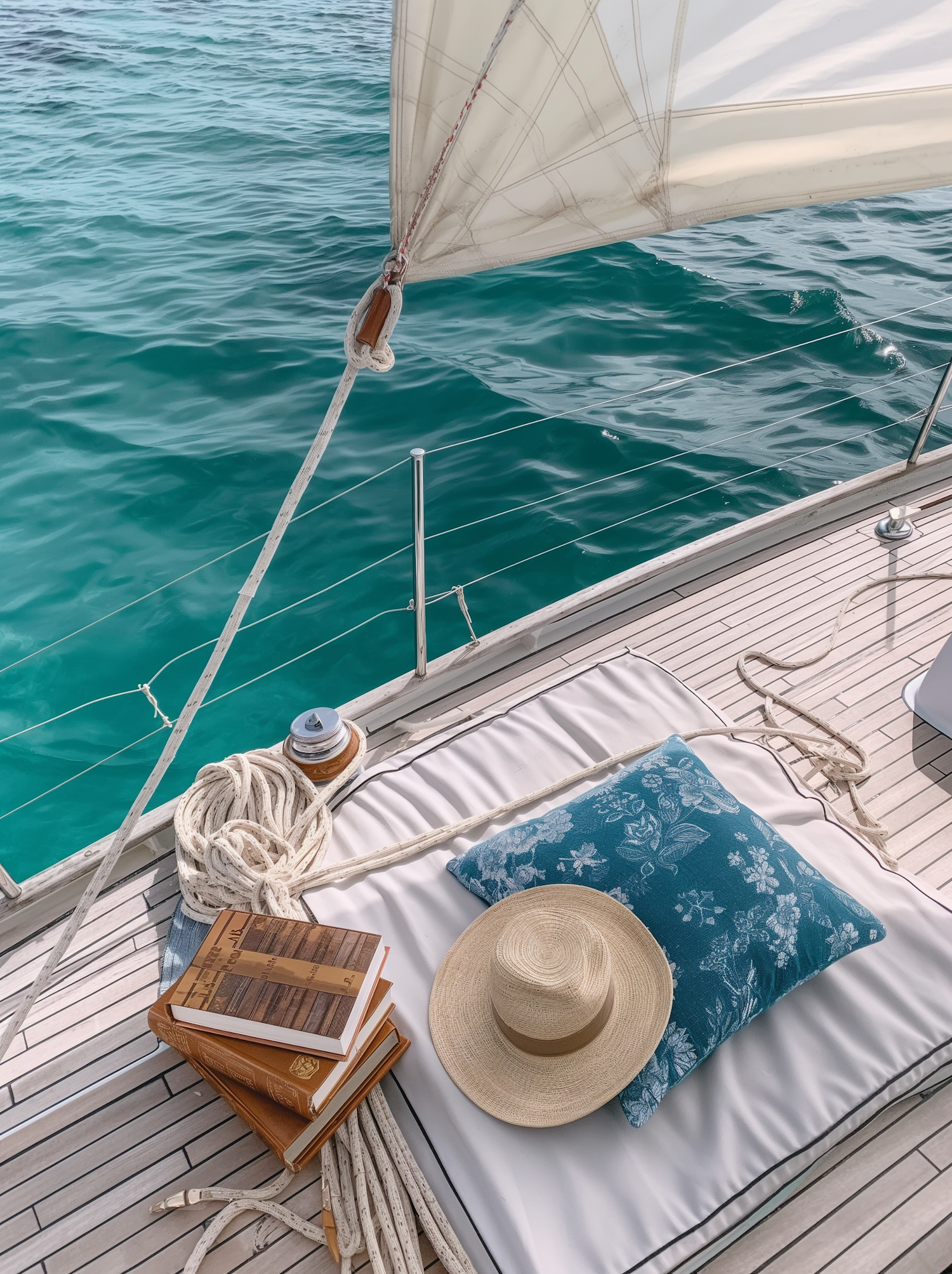 Relaxing sailboat deck with books, a straw hat, and a floral pillow against a backdrop of turquoise sea and gentle waves.