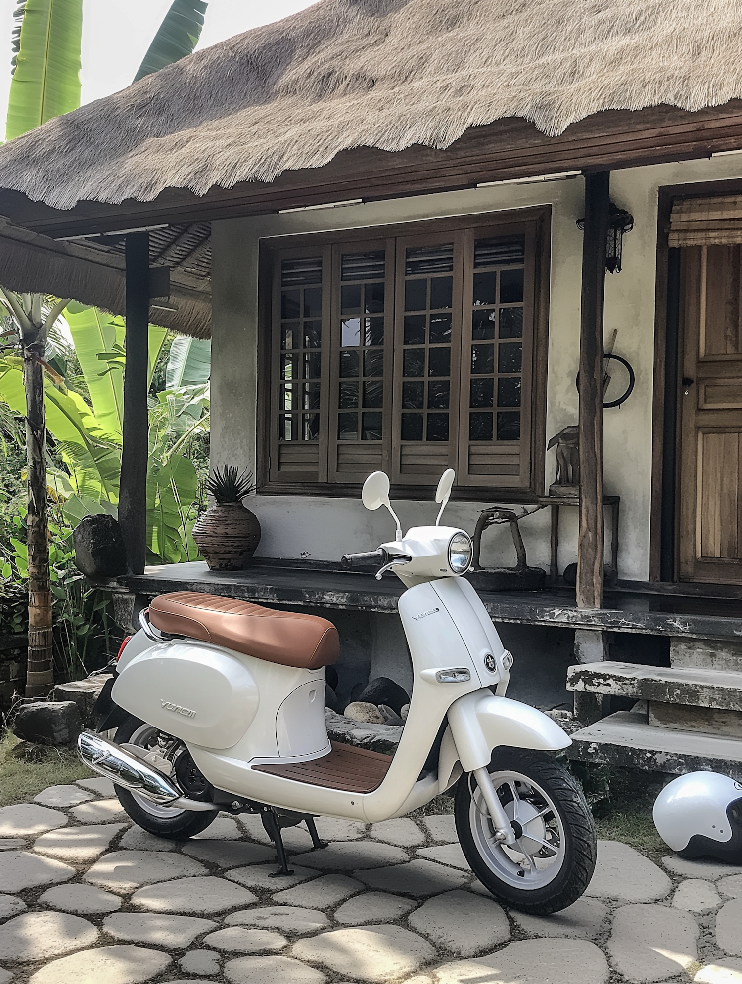 White scooter with brown seat parked by a rustic house with thatched roof, surrounded by lush greenery and a stone pathway.