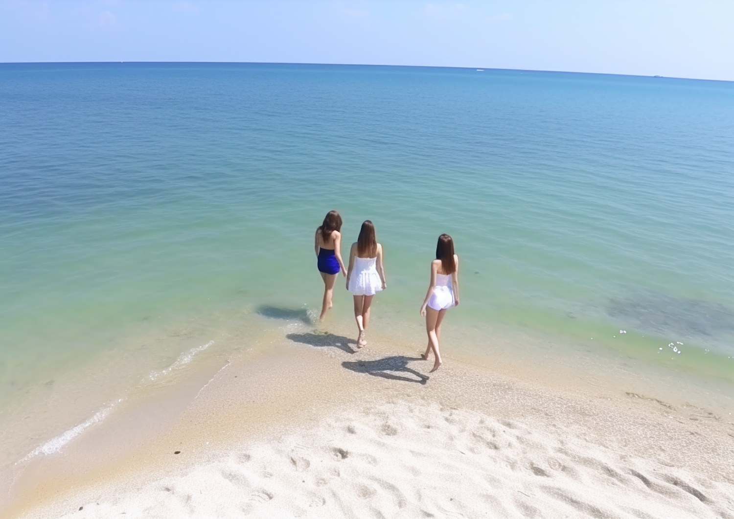 Three women in swimsuits walk towards the turquoise ocean on a sunny beach day.