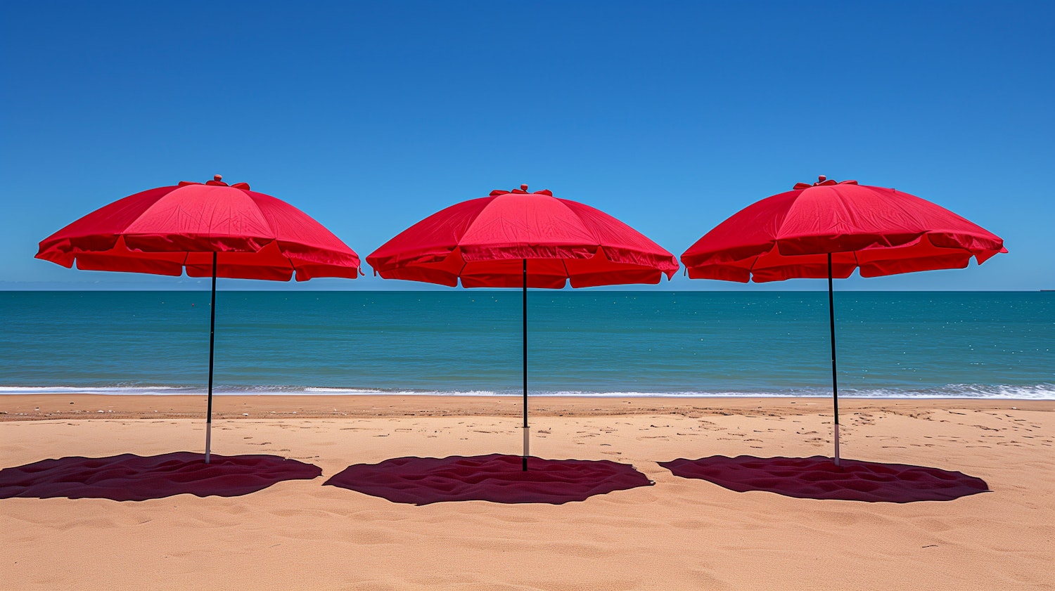 Three red beach umbrellas on a sandy shore with turquoise sea and blue sky, creating a vibrant and tranquil beach scene.