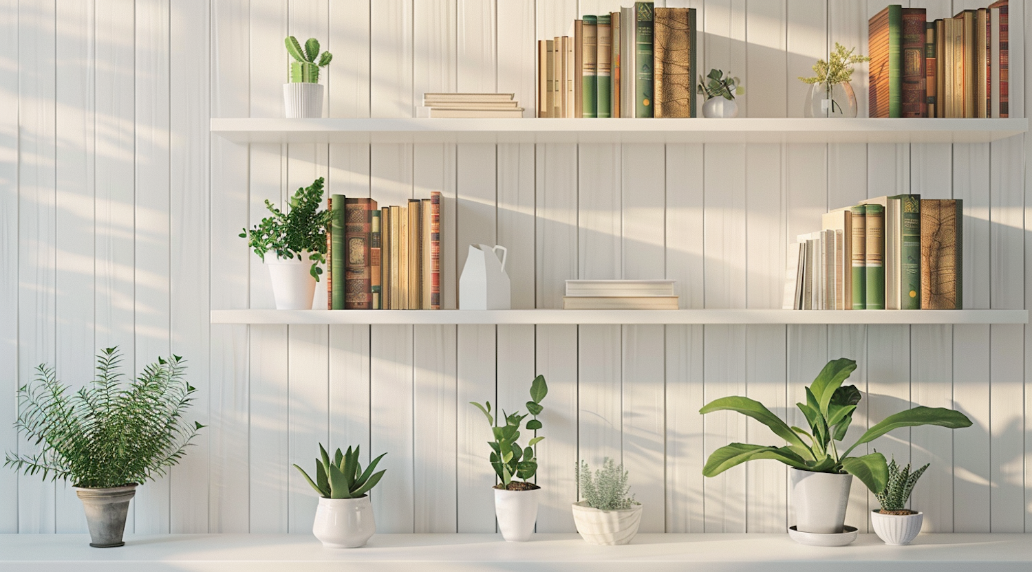Minimalist shelves with books and potted plants on a light wooden wall, creating a serene and natural interior decor.