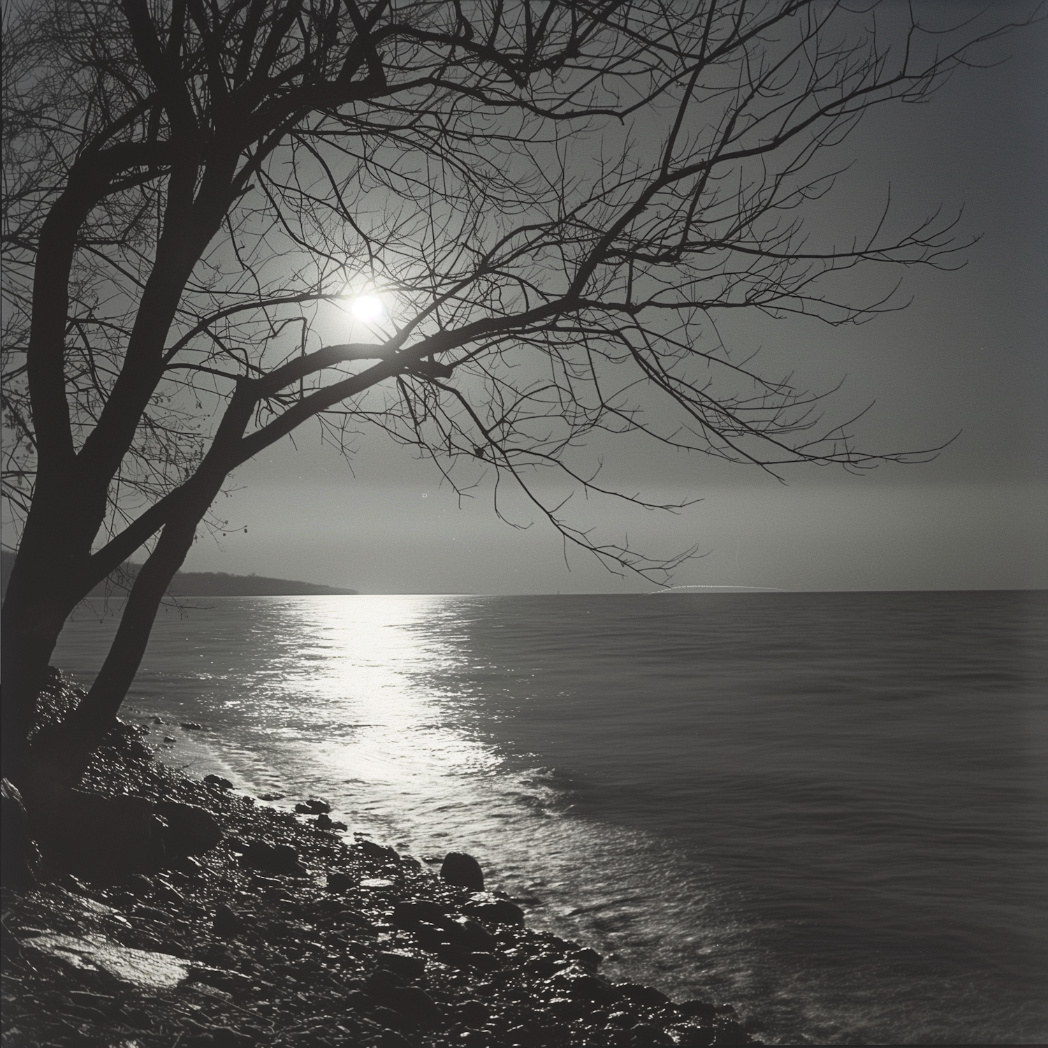 Serene black and white lakeside scene with sun reflecting on water, framed by a tree with bare branches over a rocky shore.