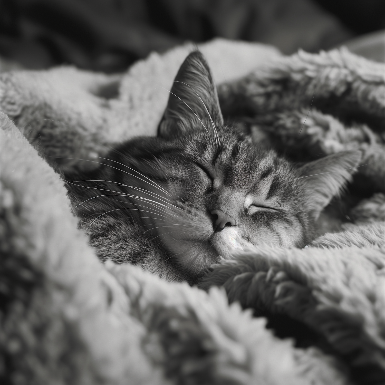 A serene black and white photo of a cat sleeping in a fluffy blanket, capturing a peaceful and cozy moment.