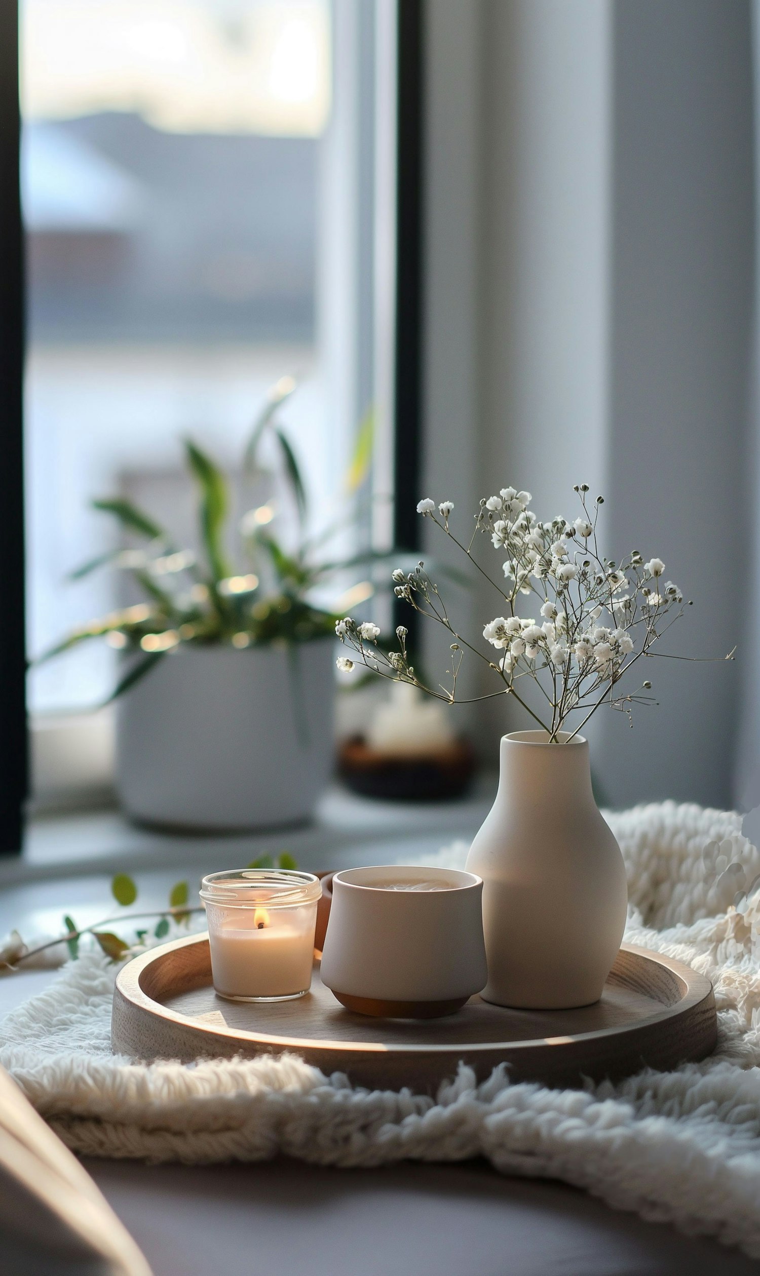 Cozy wooden tray with a lit candle, ceramic cup, and vase of baby's breath on a white blanket by a window with soft natural light.