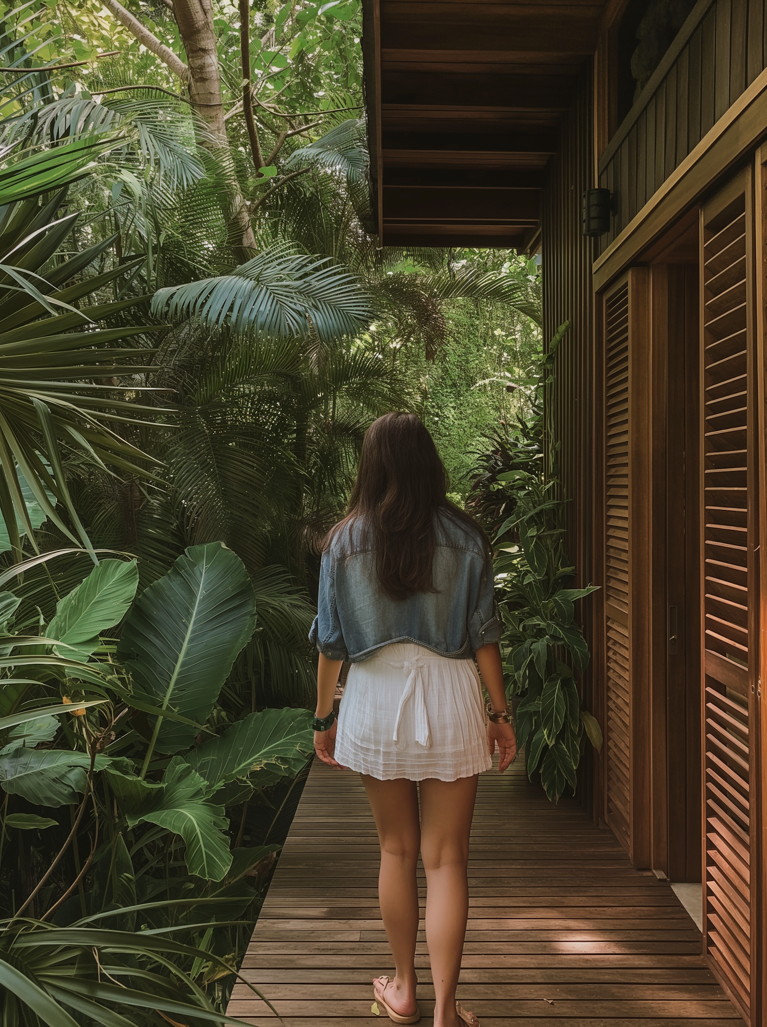 Woman in denim jacket and white skirt walks on a wooden deck surrounded by lush tropical greenery.