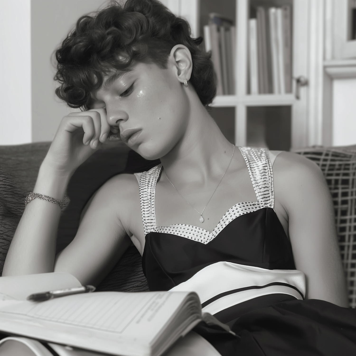 A young person with curly hair rests on a couch, eyes closed, with an open book on their lap, creating a serene and studious vibe.