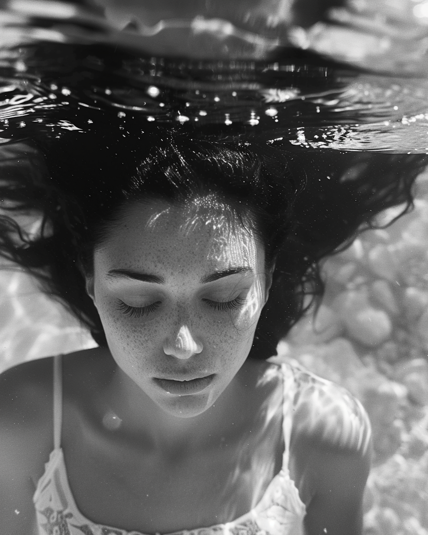 Serene underwater portrait of a woman with closed eyes, dark hair, and light skin, captured in black and white.